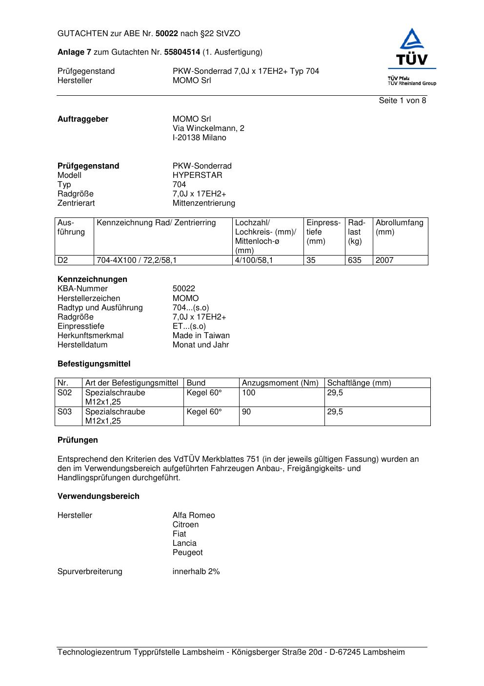 Dieses ABE gehört zur Felge Momo HYPERSTAR in 7Jx17 ET0 mit KBA 50022. Die Seite ist dafür gedacht, dass du schnell prüfen kannst, ob KBA, Design und Größe zu deiner Felge passen und danach direkt das richtige PDF lädst.