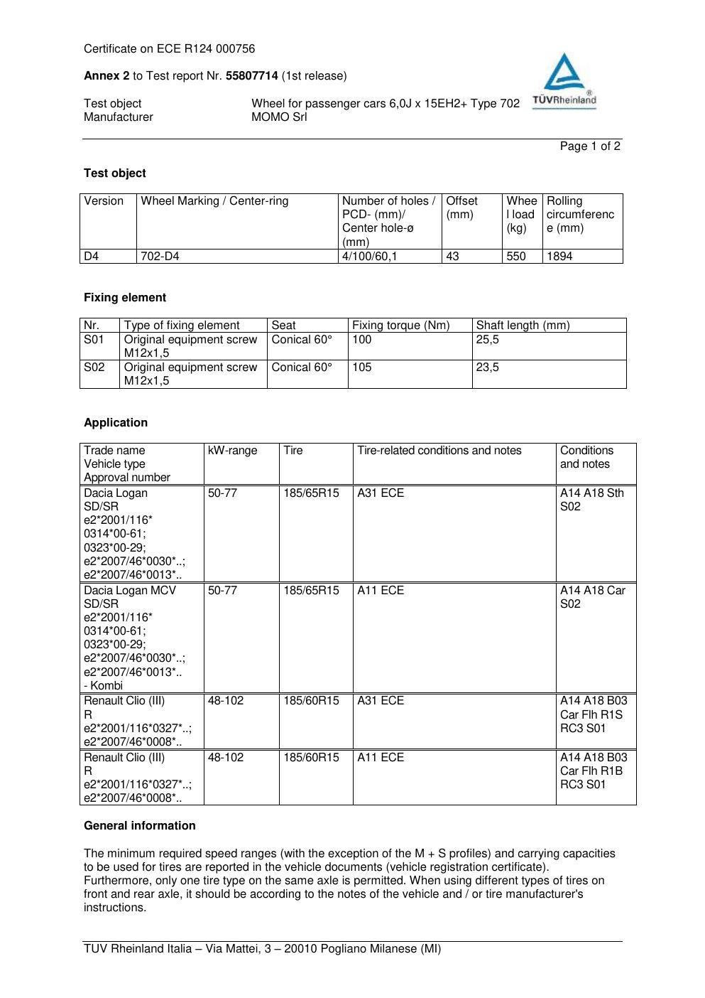 Felgengutachten / ABE für Alufelgen Momo HYPERSTAR (6Jx15 ET 0, Mittenloch 0 mm) mit KBA 000756 (Zertifikatsnummer 55807714__Anlage_2). Hier kostenlos als PDF herunterladen. Der Download-Link ist 24 Stunden gültig und kann bis zu zwei Mal verwendet werden.