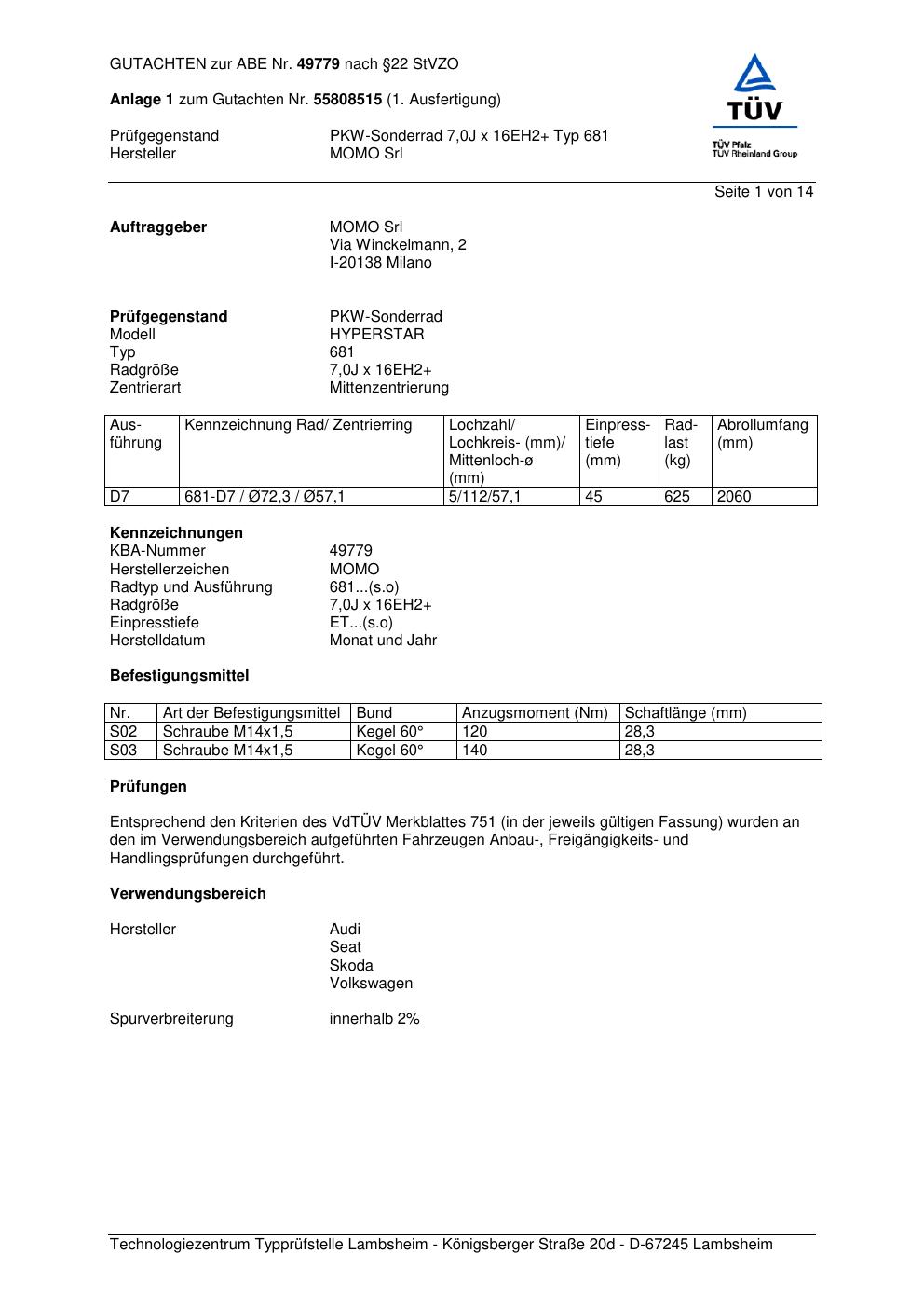 Felgengutachten / ABE für Alufelgen Momo HYPERSTAR (7Jx16 ET 0, Mittenloch 0 mm) mit KBA 49779 (Zertifikatsnummer 55808515__Anlage_1). Hier kostenlos als PDF herunterladen. Der Download-Link ist 24 Stunden gültig und kann bis zu zwei Mal verwendet werden.
