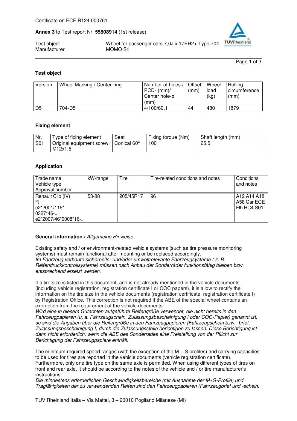 Felgengutachten / ABE für Alufelgen Momo HYPERSTAR (7Jx17 ET 0, Mittenloch 0 mm) mit KBA 000761 (Zertifikatsnummer 55808914__Anlage_3). Hier kostenlos als PDF herunterladen. Der Download-Link ist 24 Stunden gültig und kann bis zu zwei Mal verwendet werden.
