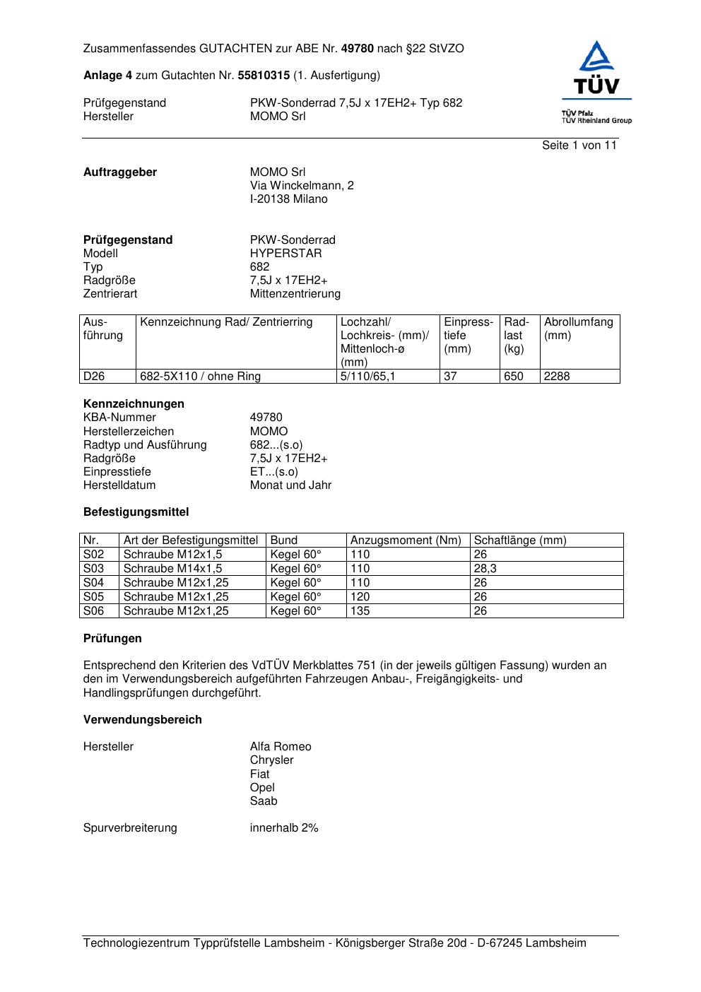 Felgengutachten / ABE für Alufelgen Momo HYPERSTAR (7.5Jx17 ET 0, Mittenloch 0 mm) mit KBA 49780 (Zertifikatsnummer 55810315__Anlage_4). Hier kostenlos als PDF herunterladen. Der Download-Link ist 24 Stunden gültig und kann bis zu zwei Mal verwendet werden.