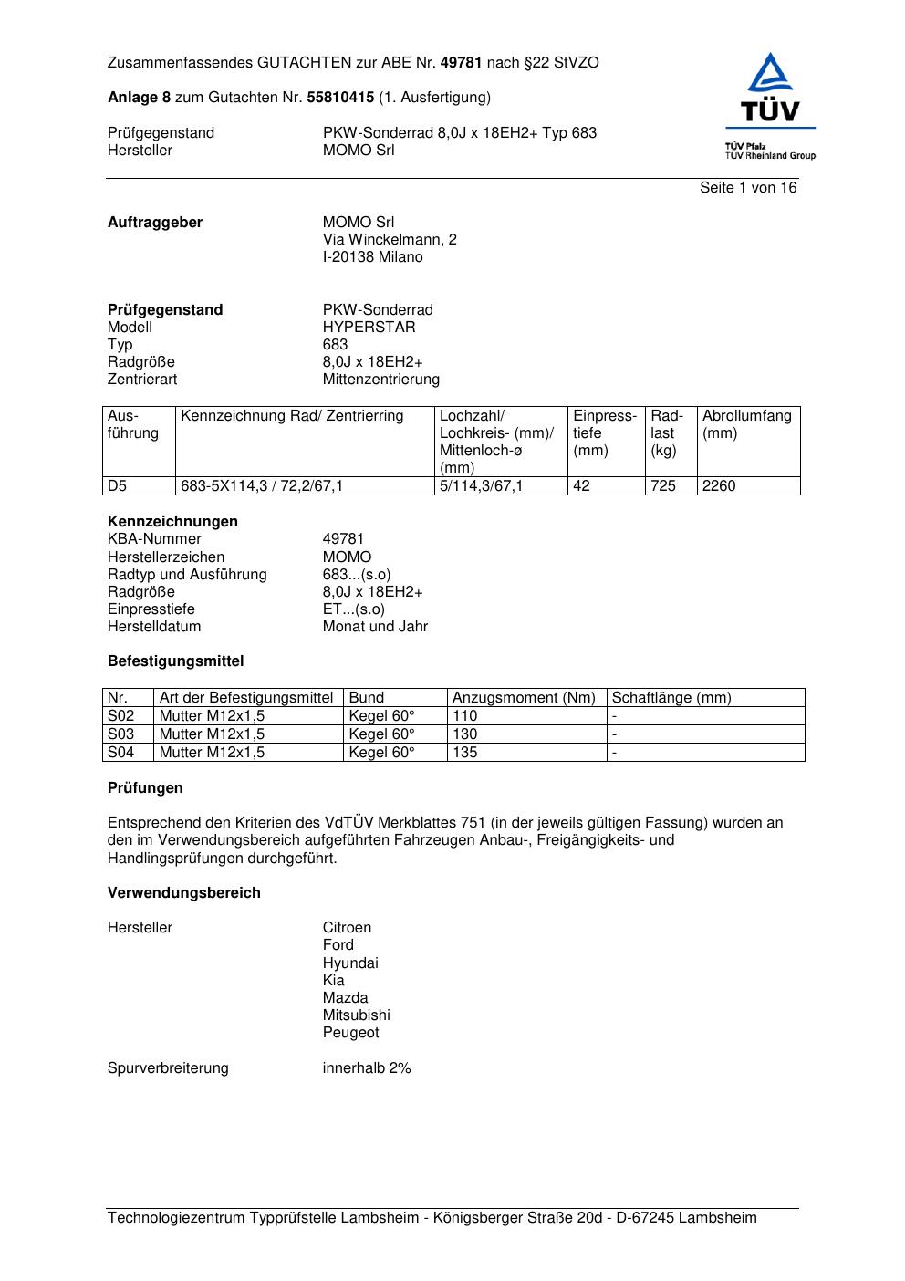 Felgengutachten / ABE für Alufelgen Momo HYPERSTAR (8Jx18 ET 0, Mittenloch 0 mm) mit KBA 49781 (Zertifikatsnummer 55810415__Anlage_8). Hier kostenlos als PDF herunterladen. Der Download-Link ist 24 Stunden gültig und kann bis zu zwei Mal verwendet werden.