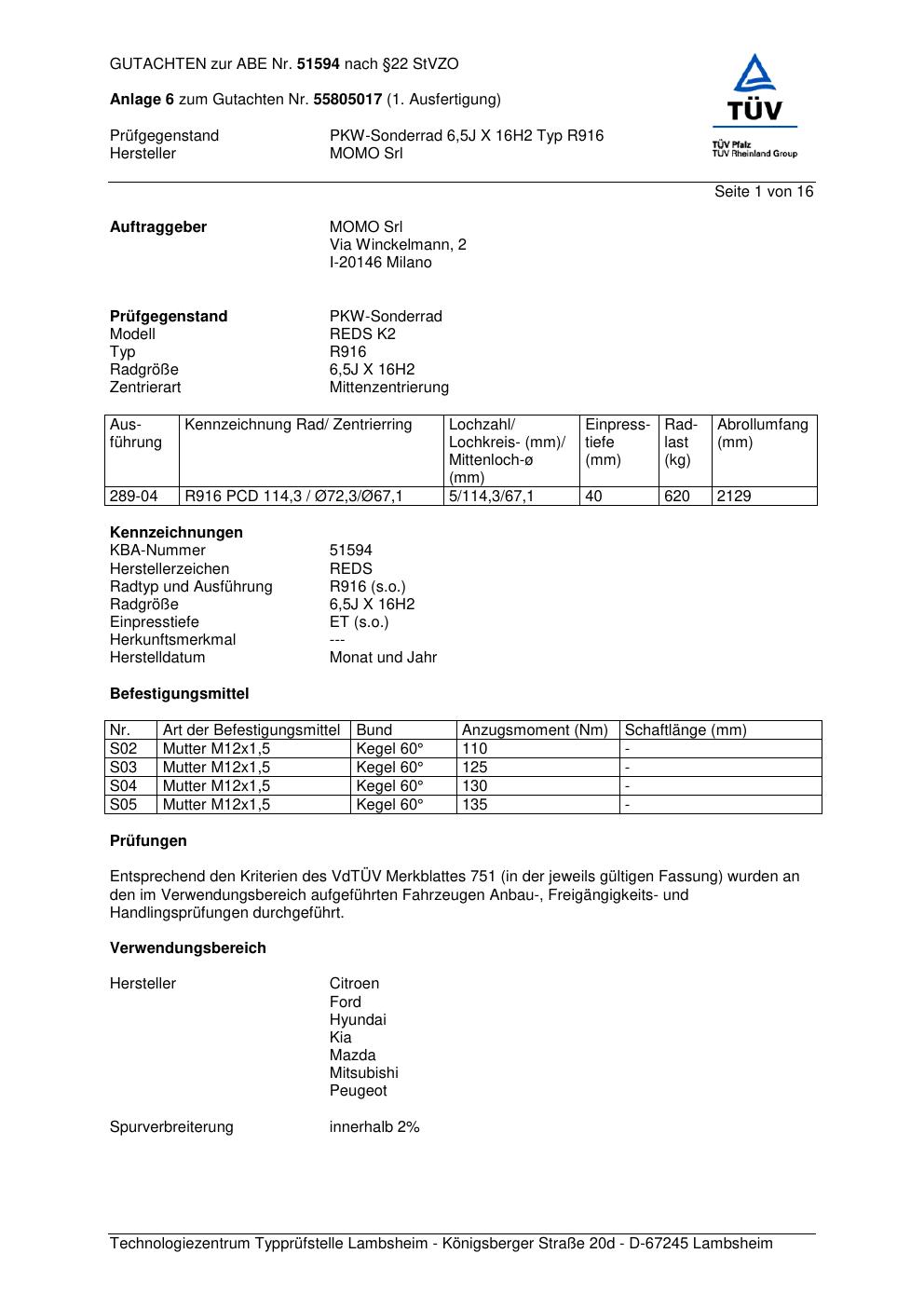 Felgengutachten / ABE für Alufelgen Momo K2 (6.5Jx16 ET 0, Mittenloch 0 mm) mit KBA 51594 (Zertifikatsnummer 55805017__Anlage_6). Hier kostenlos als PDF herunterladen. Der Download-Link ist 24 Stunden gültig und kann bis zu zwei Mal verwendet werden.