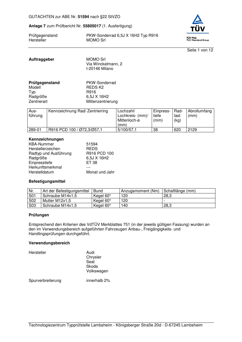 Felgengutachten / ABE für Alufelgen Momo K2 (6.5Jx16 ET 0, Mittenloch 0 mm) mit KBA 51594 (Zertifikatsnummer 55805017__Anlage_7). Hier kostenlos als PDF herunterladen. Der Download-Link ist 24 Stunden gültig und kann bis zu zwei Mal verwendet werden.