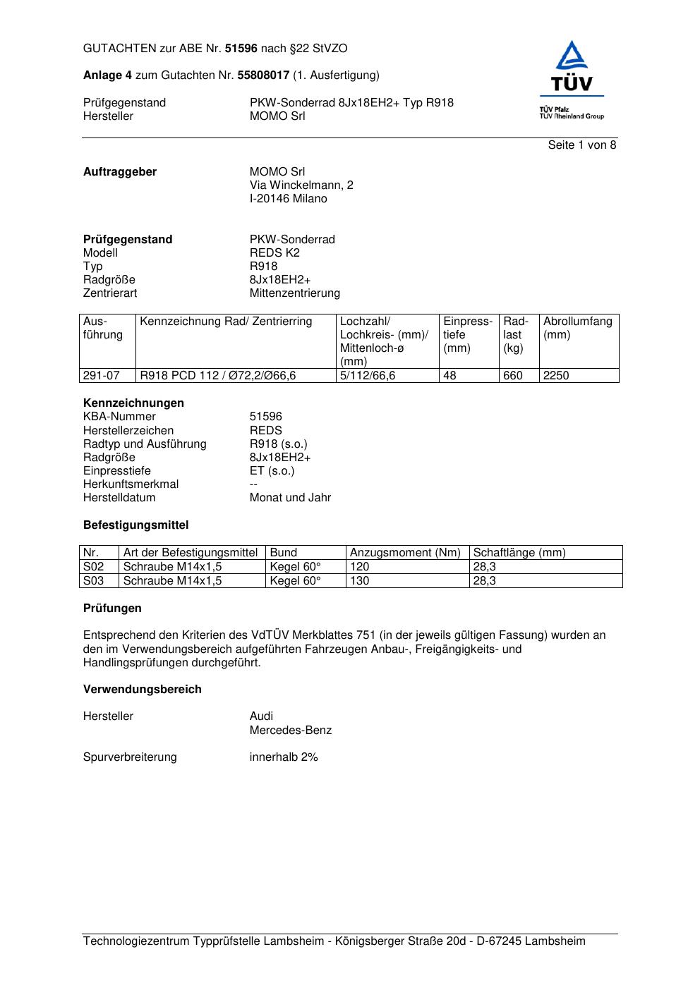 Felgengutachten / ABE für Alufelgen Momo K2 (8Jx18 ET 0, Mittenloch 0 mm) mit KBA 51596 (Zertifikatsnummer 55808017__Anlage_4). Hier kostenlos als PDF herunterladen. Der Download-Link ist 24 Stunden gültig und kann bis zu zwei Mal verwendet werden.