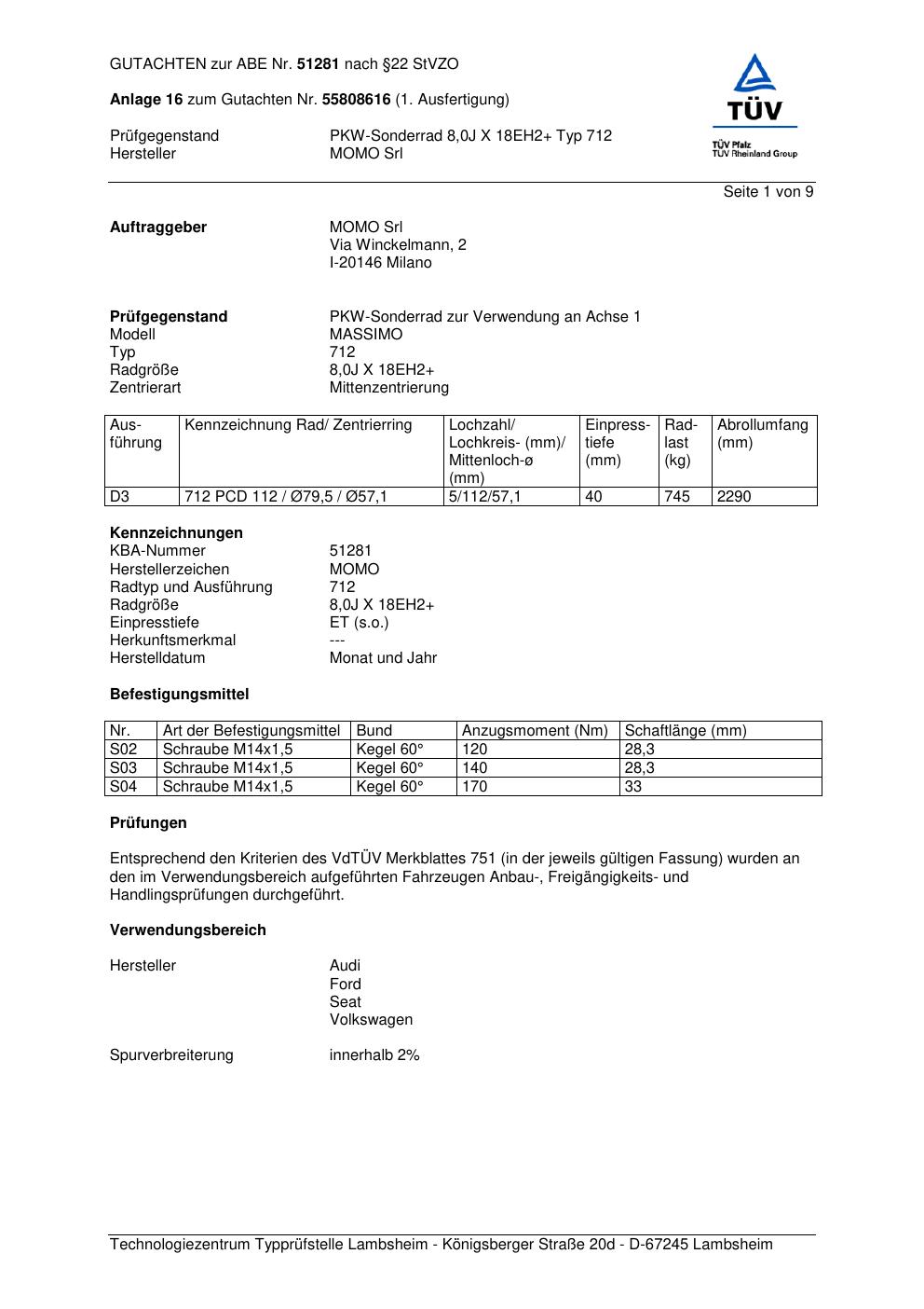Dieses Gutachten (ABE) bezieht sich auf die Alufelge Momo MASSIMO in der Ausführung 8Jx18 ET 0, Mittenloch 0 mm (KBA 51281). Im PDF findest du typischerweise zulässige Reifengrößen, Auflagen/Anbauhinweise und – je nach Dokument – Hinweise zur Eintragung.