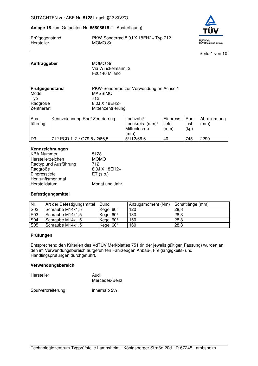 Felgengutachten / ABE für Alufelgen Momo MASSIMO (8Jx18 ET 0, Mittenloch 0 mm) mit KBA 51281 (Zertifikatsnummer 55808616__Anlage_18). Hier kostenlos als PDF herunterladen. Der Download-Link ist 24 Stunden gültig und kann bis zu zwei Mal verwendet werden.