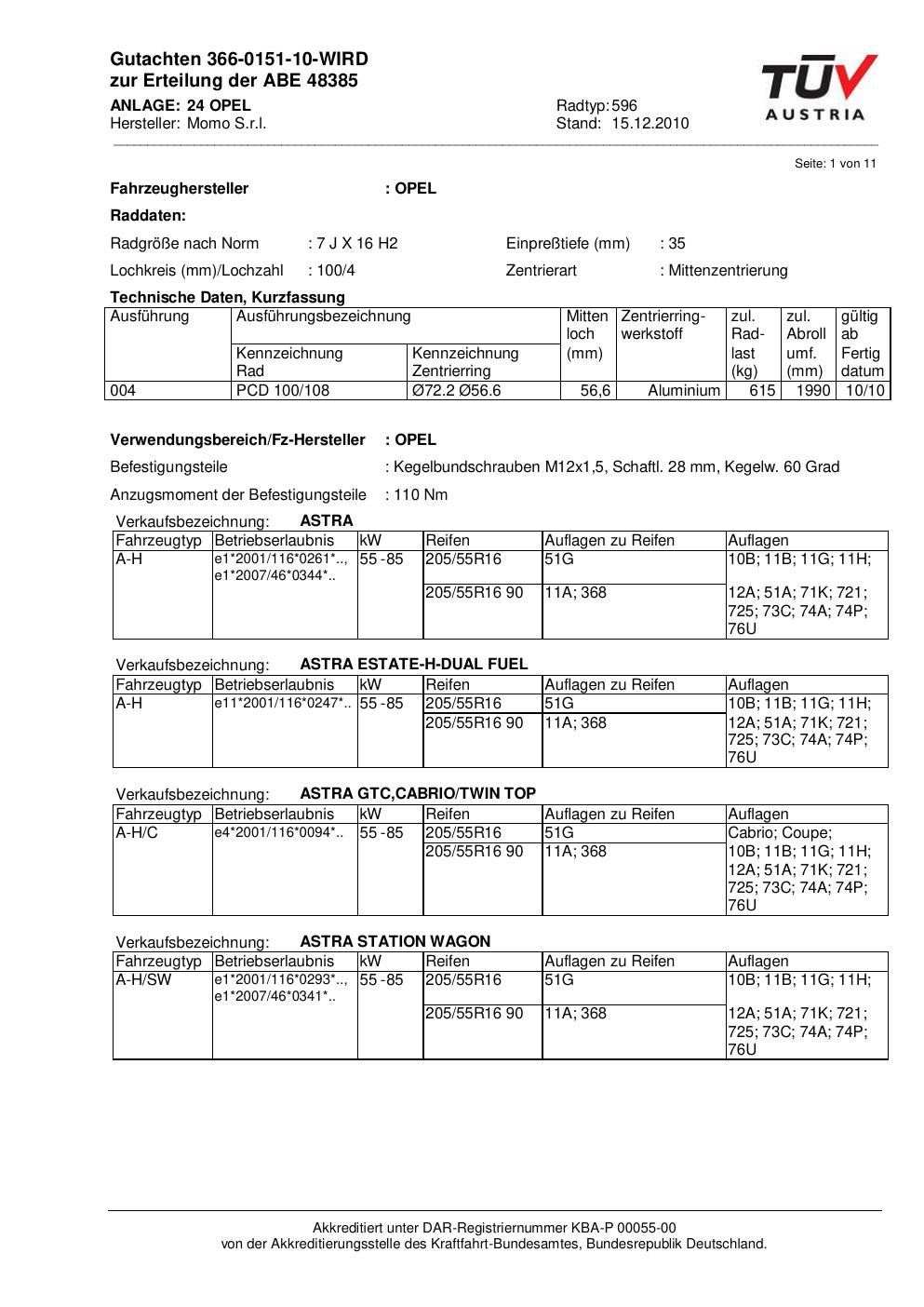 Felgengutachten / ABE für Alufelgen Momo NEXT (7Jx16 ET 0, Mittenloch 0 mm) mit KBA 48385 (Zertifikatsnummer 366-0151-10-WIRD__Anlage_24). Hier kostenlos als PDF herunterladen. Der Download-Link ist 24 Stunden gültig und kann bis zu zwei Mal verwendet werden.