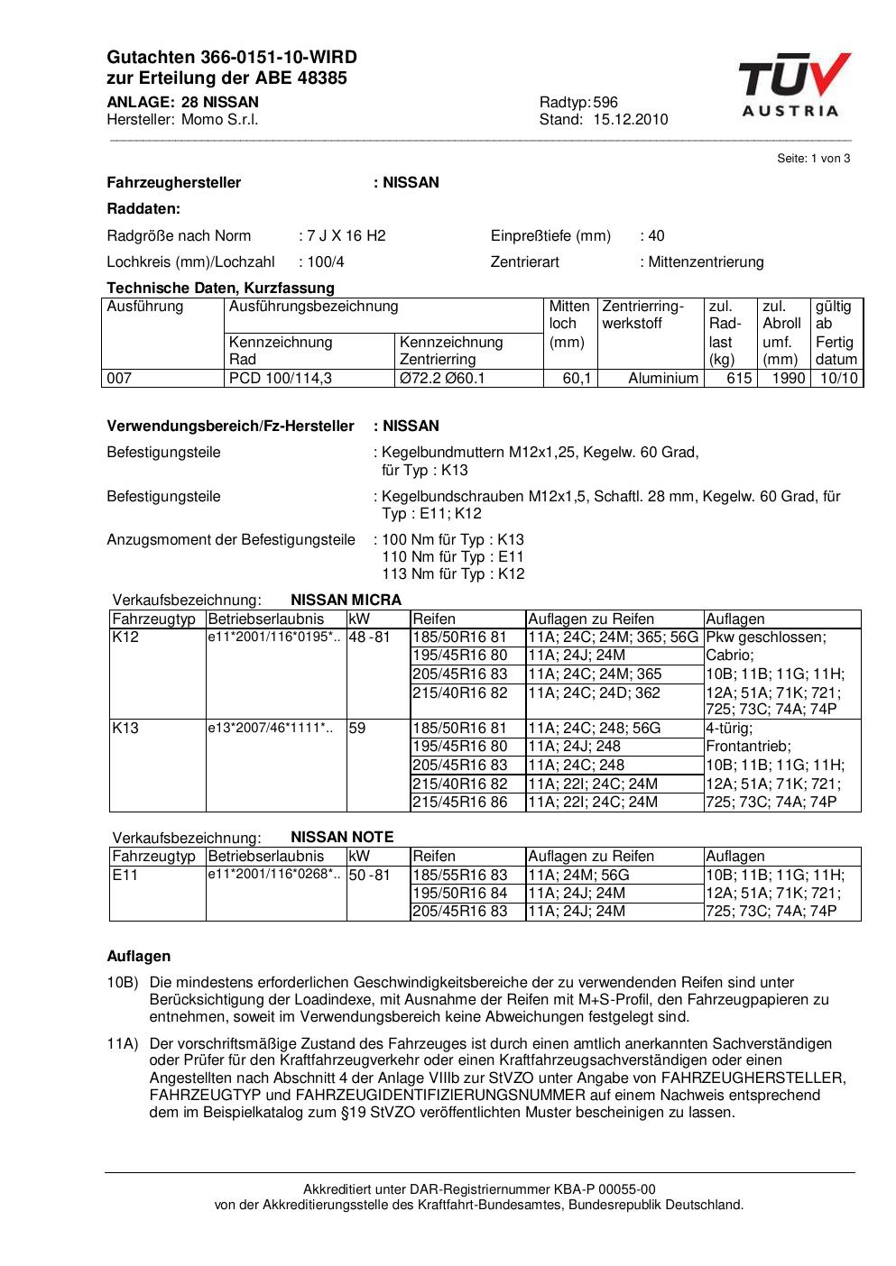 Felgengutachten / ABE für Alufelgen Momo NEXT (7Jx16 ET 0, Mittenloch 0 mm) mit KBA 48385 (Zertifikatsnummer 366-0151-10-WIRD__Anlage_28). Hier kostenlos als PDF herunterladen. Der Download-Link ist 24 Stunden gültig und kann bis zu zwei Mal verwendet werden.