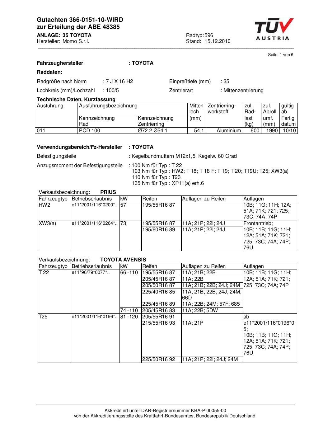 Felgengutachten / ABE für Alufelgen Momo NEXT (7Jx16 ET 0, Mittenloch 0 mm) mit KBA 48385 (Zertifikatsnummer 366-0151-10-WIRD__Anlage_35). Hier kostenlos als PDF herunterladen. Der Download-Link ist 24 Stunden gültig und kann bis zu zwei Mal verwendet werden.