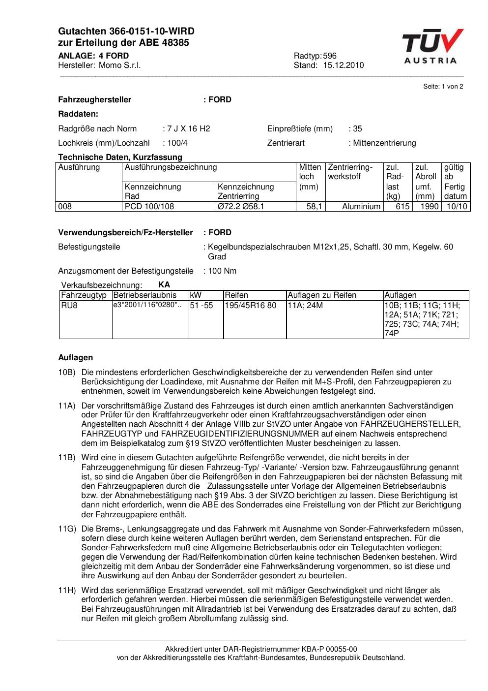 Felgengutachten / ABE für Alufelgen Momo NEXT (7Jx16 ET 0, Mittenloch 0 mm) mit KBA 48385 (Zertifikatsnummer 366-0151-10-WIRD__Anlage_4). Hier kostenlos als PDF herunterladen. Der Download-Link ist 24 Stunden gültig und kann bis zu zwei Mal verwendet werden.