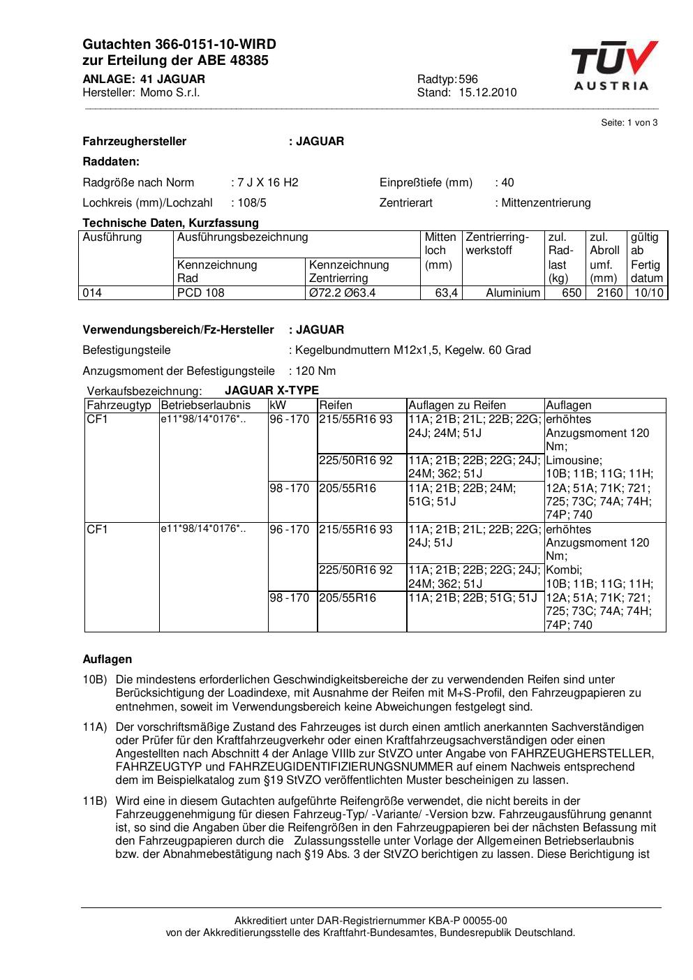 Felgengutachten / ABE für Alufelgen Momo NEXT (7Jx16 ET 0, Mittenloch 0 mm) mit KBA 48385 (Zertifikatsnummer 366-0151-10-WIRD__Anlage_41). Hier kostenlos als PDF herunterladen. Der Download-Link ist 24 Stunden gültig und kann bis zu zwei Mal verwendet werden.