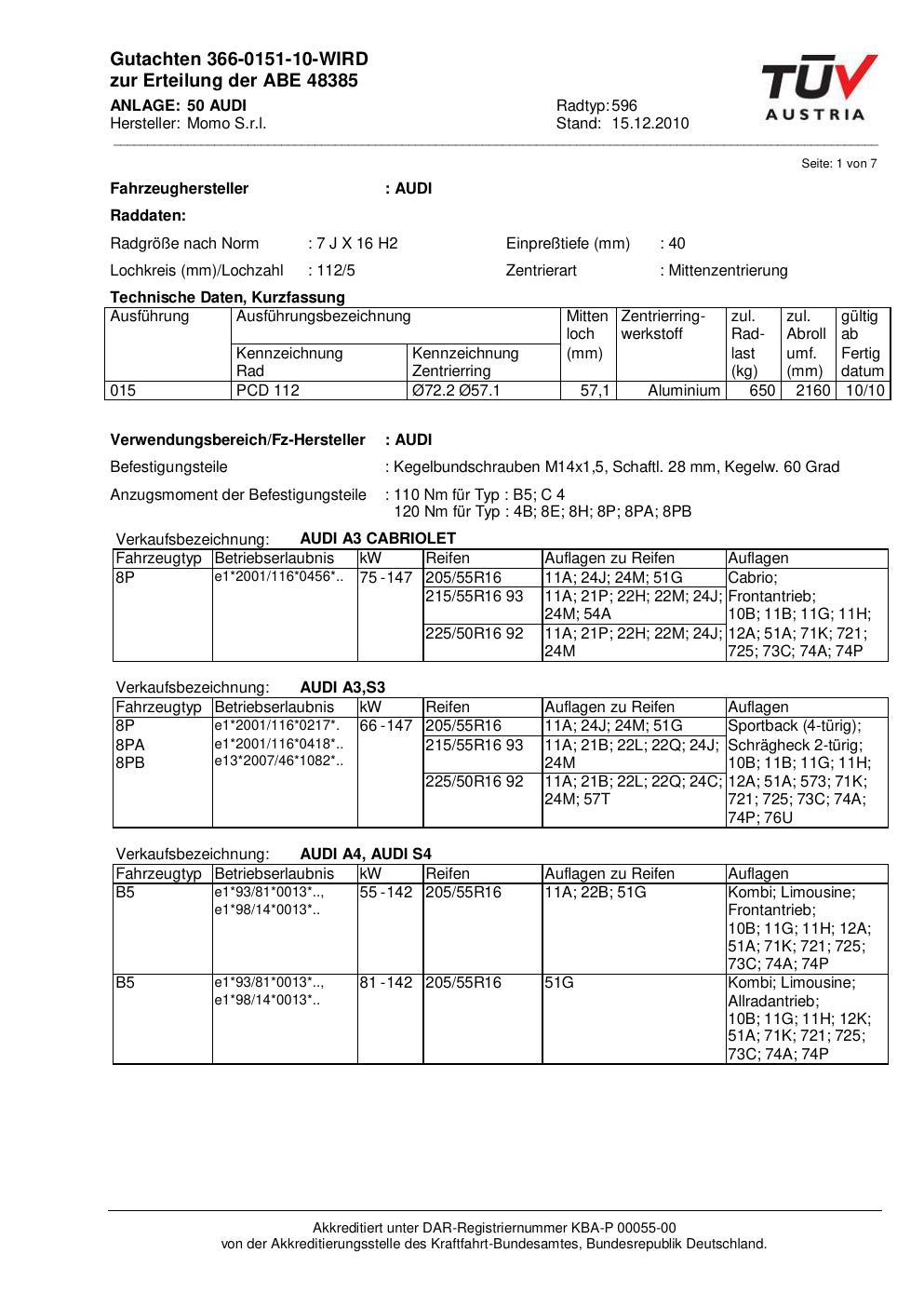 Felgengutachten / ABE für Alufelgen Momo NEXT (7Jx16 ET 0, Mittenloch 0 mm) mit KBA 48385 (Zertifikatsnummer 366-0151-10-WIRD__Anlage_50). Hier kostenlos als PDF herunterladen. Der Download-Link ist 24 Stunden gültig und kann bis zu zwei Mal verwendet werden.