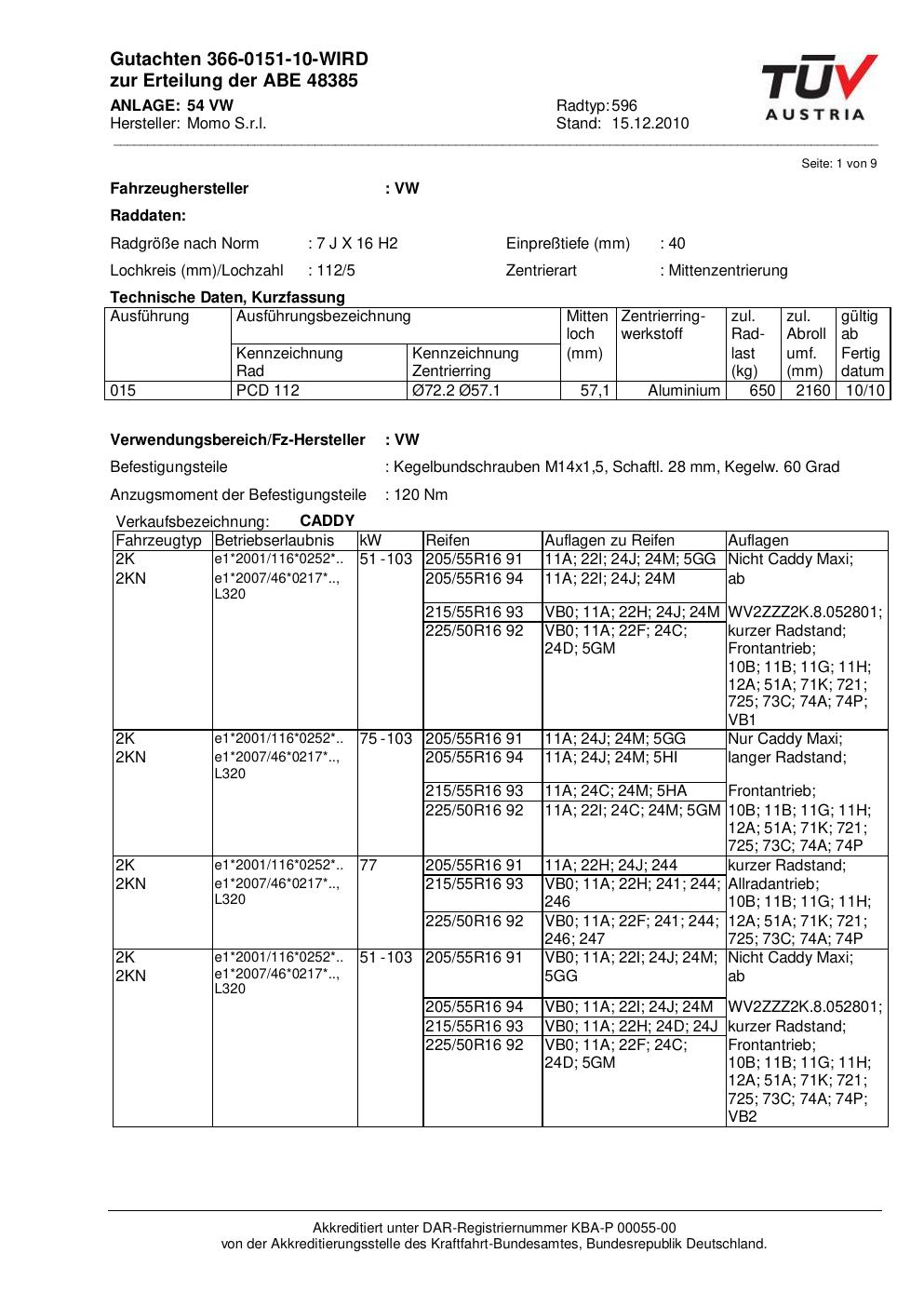 Felgengutachten / ABE für Alufelgen Momo NEXT (7Jx16 ET 0, Mittenloch 0 mm) mit KBA 48385 (Zertifikatsnummer 366-0151-10-WIRD__Anlage_54). Hier kostenlos als PDF herunterladen. Der Download-Link ist 24 Stunden gültig und kann bis zu zwei Mal verwendet werden.