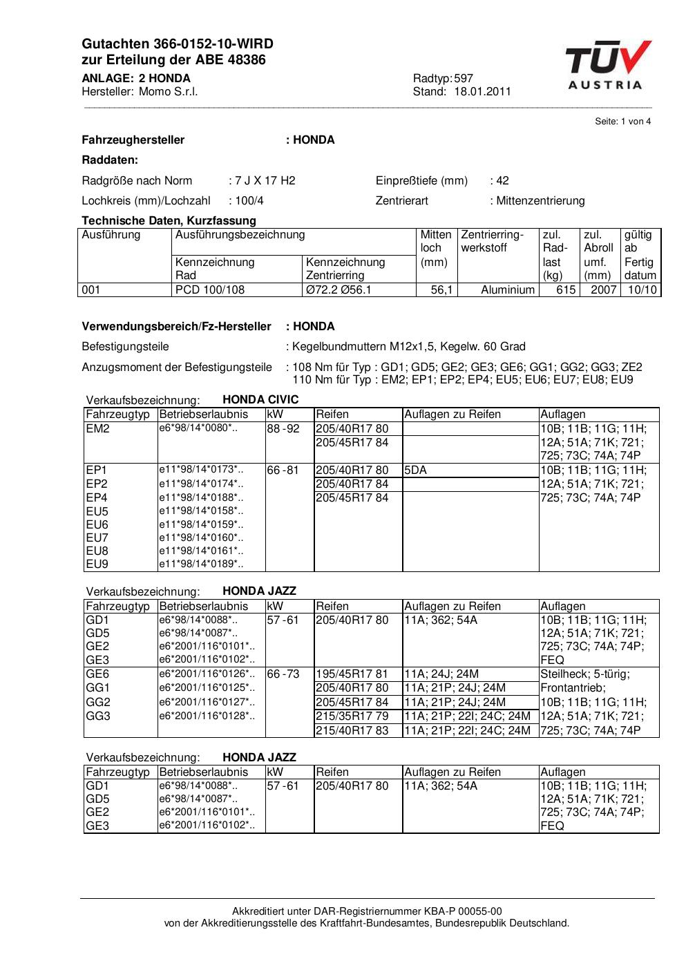Felgengutachten / ABE für Alufelgen Momo NEXT (7Jx17 ET 0, Mittenloch 0 mm) mit KBA 48386 (Zertifikatsnummer 366-0152-10-WIRD__Anlage_2). Hier kostenlos als PDF herunterladen. Der Download-Link ist 24 Stunden gültig und kann bis zu zwei Mal verwendet werden.