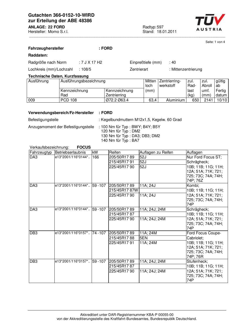 Felgengutachten / ABE für Alufelgen Momo NEXT (7Jx17 ET 0, Mittenloch 0 mm) mit KBA 48386 (Zertifikatsnummer 366-0152-10-WIRD__Anlage_22). Hier kostenlos als PDF herunterladen. Der Download-Link ist 24 Stunden gültig und kann bis zu zwei Mal verwendet werden.