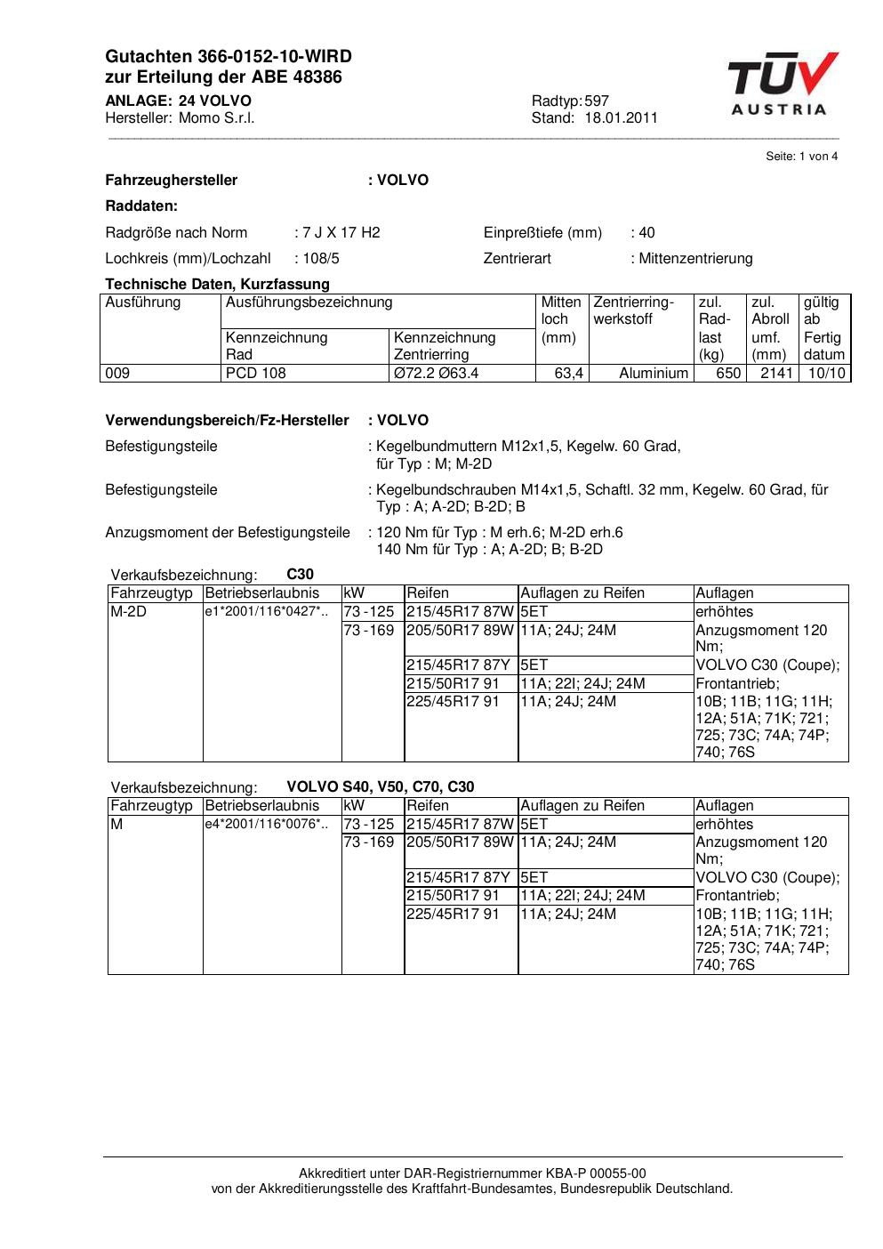 Felgengutachten / ABE für Alufelgen Momo NEXT (7Jx17 ET 0, Mittenloch 0 mm) mit KBA 48386 (Zertifikatsnummer 366-0152-10-WIRD__Anlage_24). Hier kostenlos als PDF herunterladen. Der Download-Link ist 24 Stunden gültig und kann bis zu zwei Mal verwendet werden.