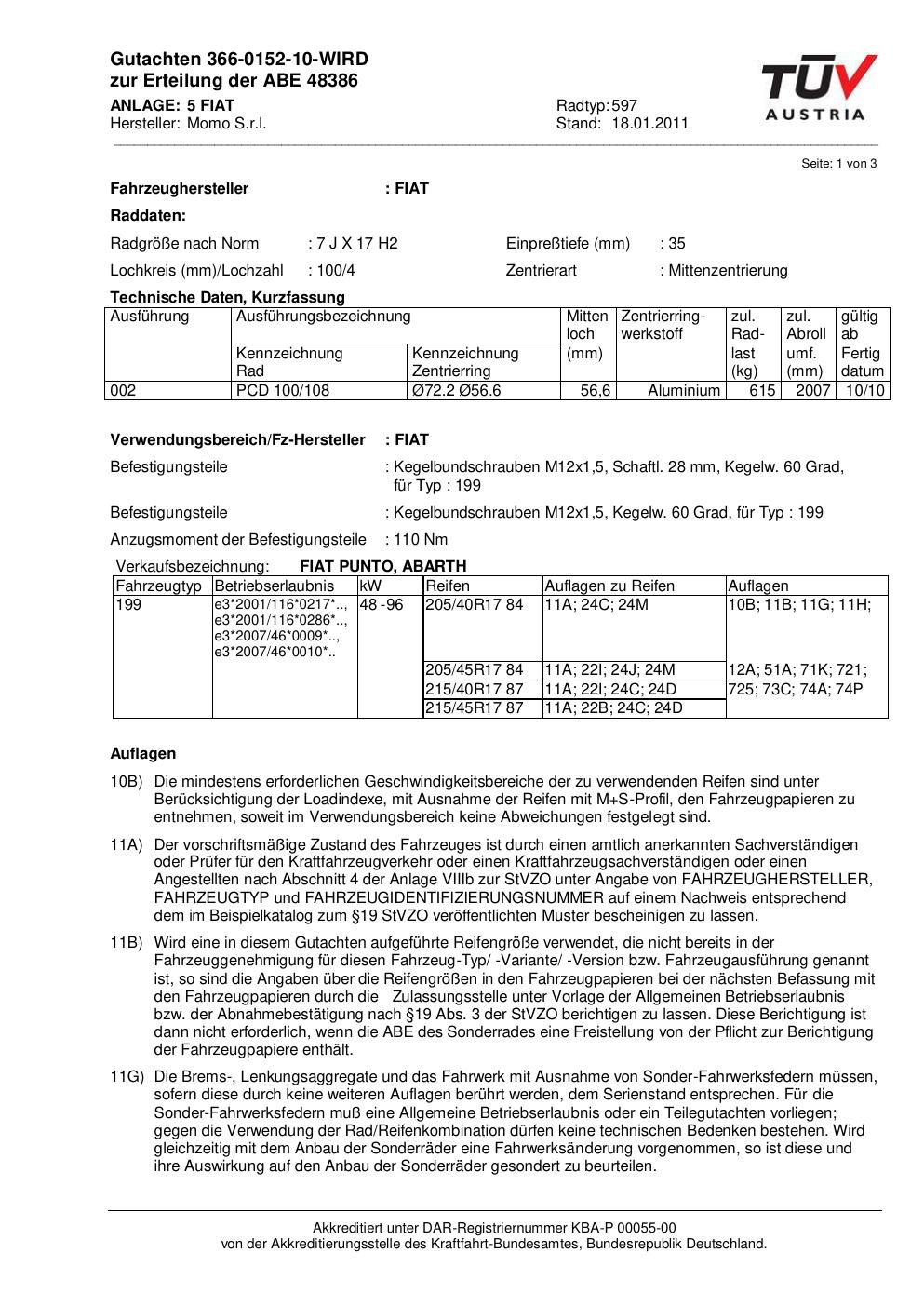 Felgengutachten / ABE für Alufelgen Momo NEXT (7Jx17 ET 0, Mittenloch 0 mm) mit KBA 48386 (Zertifikatsnummer 366-0152-10-WIRD__Anlage_5). Hier kostenlos als PDF herunterladen. Der Download-Link ist 24 Stunden gültig und kann bis zu zwei Mal verwendet werden.