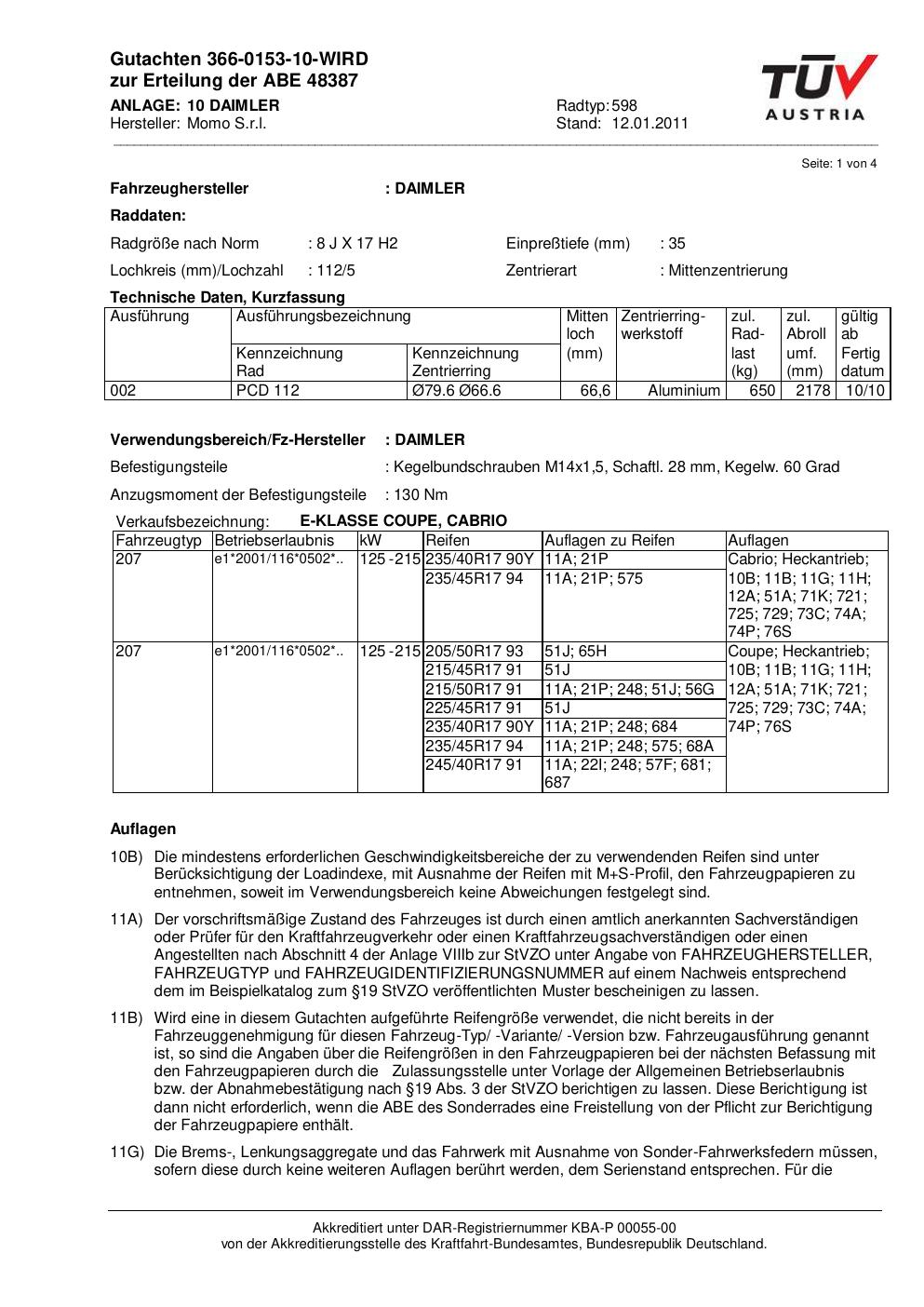 Felgengutachten / ABE für Alufelgen Momo NEXT (8Jx17 ET 0, Mittenloch 0 mm) mit KBA 48387 (Zertifikatsnummer 366-0153-10-WIRD__Anlage_10). Hier kostenlos als PDF herunterladen. Der Download-Link ist 24 Stunden gültig und kann bis zu zwei Mal verwendet werden.