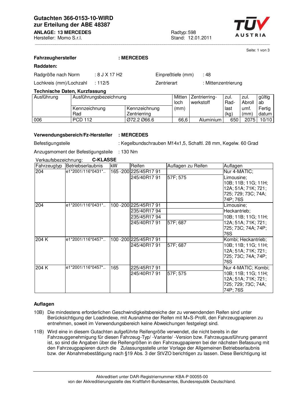 Felgengutachten / ABE für Alufelgen Momo NEXT (8Jx17 ET 0, Mittenloch 0 mm) mit KBA 48387 (Zertifikatsnummer 366-0153-10-WIRD__Anlage_13). Hier kostenlos als PDF herunterladen. Der Download-Link ist 24 Stunden gültig und kann bis zu zwei Mal verwendet werden.