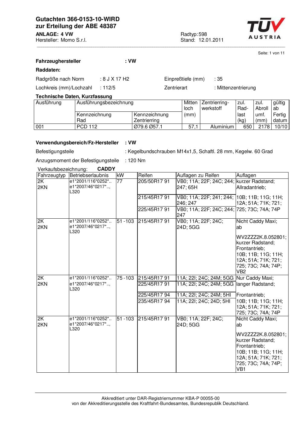 Felgengutachten / ABE für Alufelgen Momo NEXT (8Jx17 ET 0, Mittenloch 0 mm) mit KBA 48387 (Zertifikatsnummer 366-0153-10-WIRD__Anlage_4). Hier kostenlos als PDF herunterladen. Der Download-Link ist 24 Stunden gültig und kann bis zu zwei Mal verwendet werden.