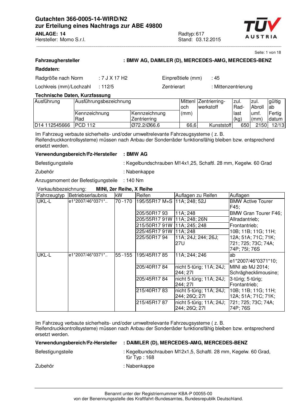 Felgengutachten / ABE für Alufelgen Momo QUANTUM (7Jx17 ET 0, Mittenloch 0 mm) mit KBA 49800 (Zertifikatsnummer 366-0005-14-WIRD/N2__Anlage_14). Hier kostenlos als PDF herunterladen. Der Download-Link ist 24 Stunden gültig und kann bis zu zwei Mal verwendet werden.