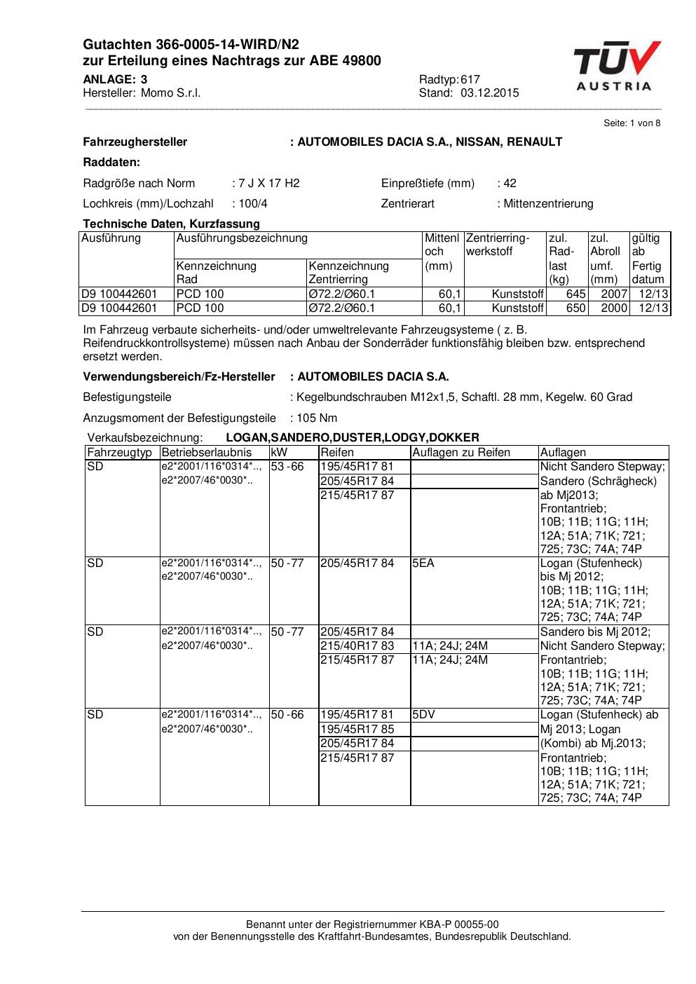 Felgengutachten / ABE für Alufelgen Momo QUANTUM (7Jx17 ET 0, Mittenloch 0 mm) mit KBA 49800 (Zertifikatsnummer 366-0005-14-WIRD/N2__Anlage_3). Hier kostenlos als PDF herunterladen. Der Download-Link ist 24 Stunden gültig und kann bis zu zwei Mal verwendet werden.