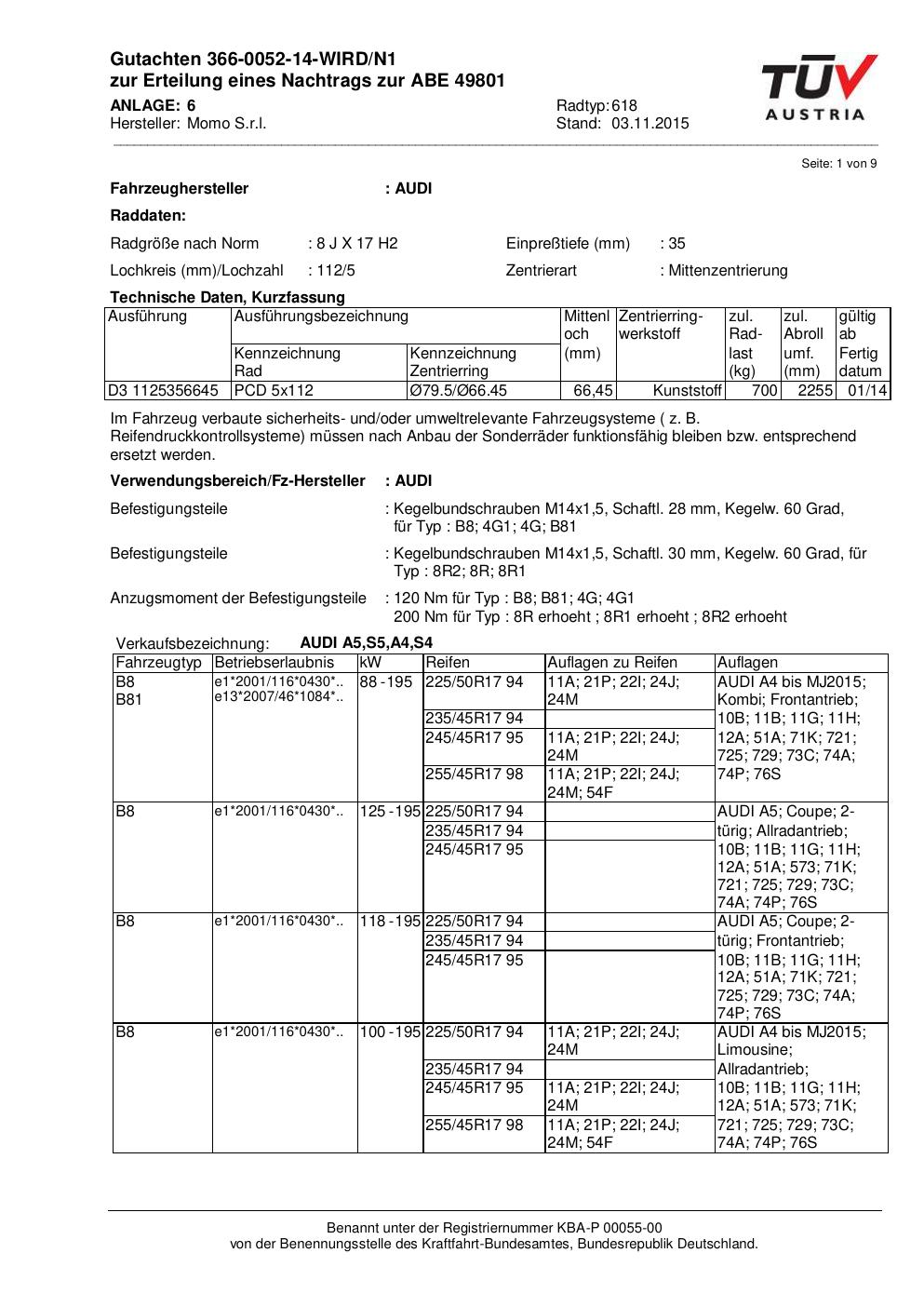 Felgengutachten / ABE für Alufelgen Momo QUANTUM (8Jx17 ET 0, Mittenloch 0 mm) mit KBA 49801 (Zertifikatsnummer 366-0052-14-WIRD/N1__Anlage_6). Hier kostenlos als PDF herunterladen. Der Download-Link ist 24 Stunden gültig und kann bis zu zwei Mal verwendet werden.