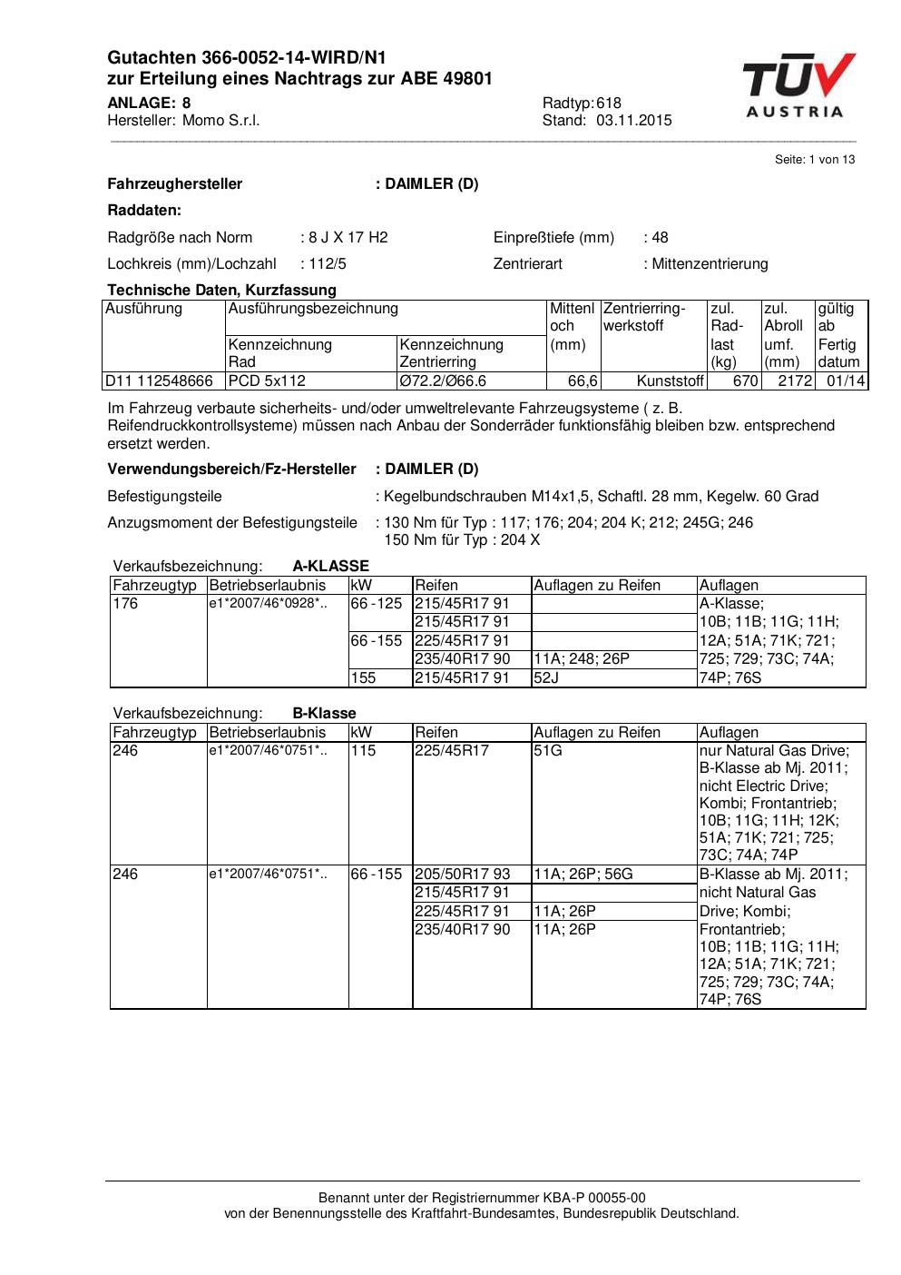 Felgengutachten / ABE für Alufelgen Momo QUANTUM (8Jx17 ET 0, Mittenloch 0 mm) mit KBA 49801 (Zertifikatsnummer 366-0052-14-WIRD/N1__Anlage_8). Hier kostenlos als PDF herunterladen. Der Download-Link ist 24 Stunden gültig und kann bis zu zwei Mal verwendet werden.