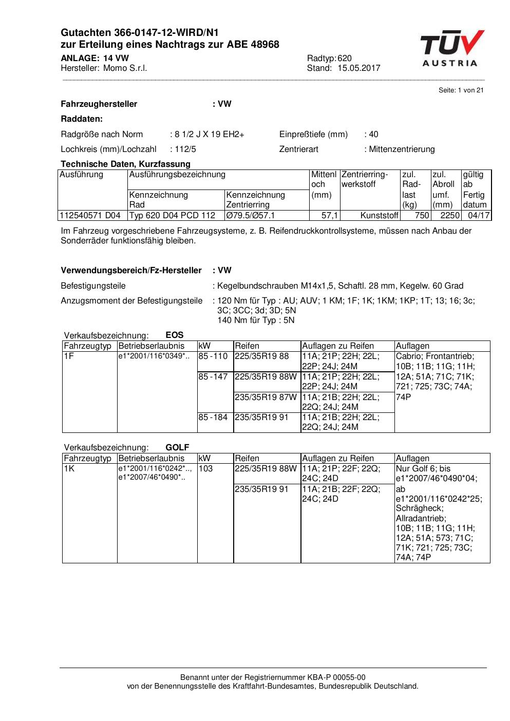 Felgengutachten / ABE für Alufelgen Momo QUANTUM (8.5Jx19 ET 0, Mittenloch 0 mm) mit KBA 48968 (Zertifikatsnummer 366-0147-12-WIRD/N1__Anlage_14). Hier kostenlos als PDF herunterladen. Der Download-Link ist 24 Stunden gültig und kann bis zu zwei Mal verwendet werden.