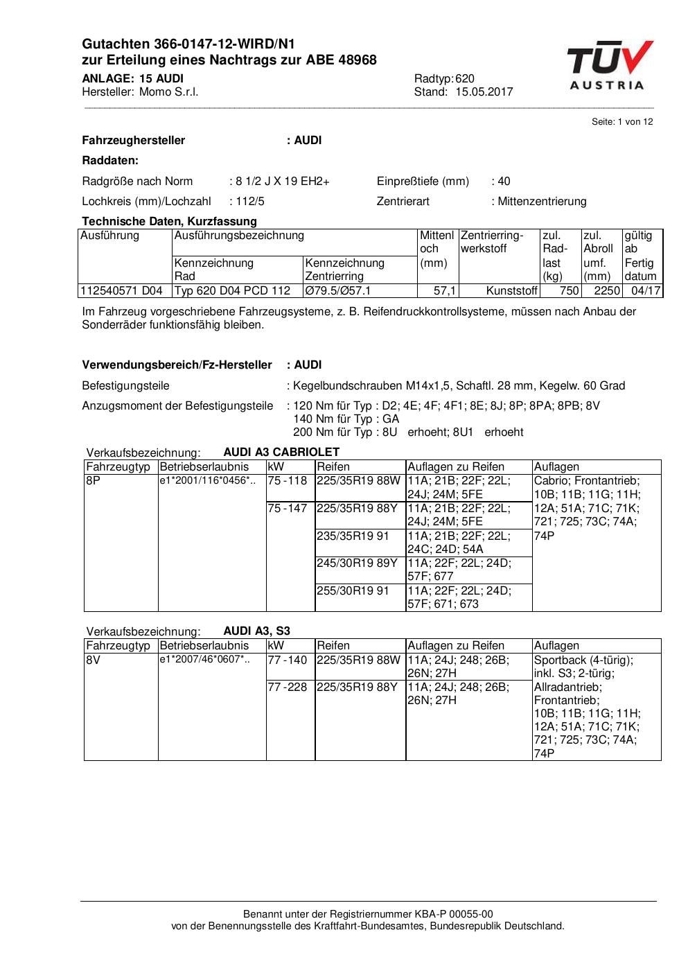 Felgengutachten / ABE für Alufelgen Momo QUANTUM (8.5Jx19 ET 0, Mittenloch 0 mm) mit KBA 48968 (Zertifikatsnummer 366-0147-12-WIRD/N1__Anlage_15). Hier kostenlos als PDF herunterladen. Der Download-Link ist 24 Stunden gültig und kann bis zu zwei Mal verwendet werden.