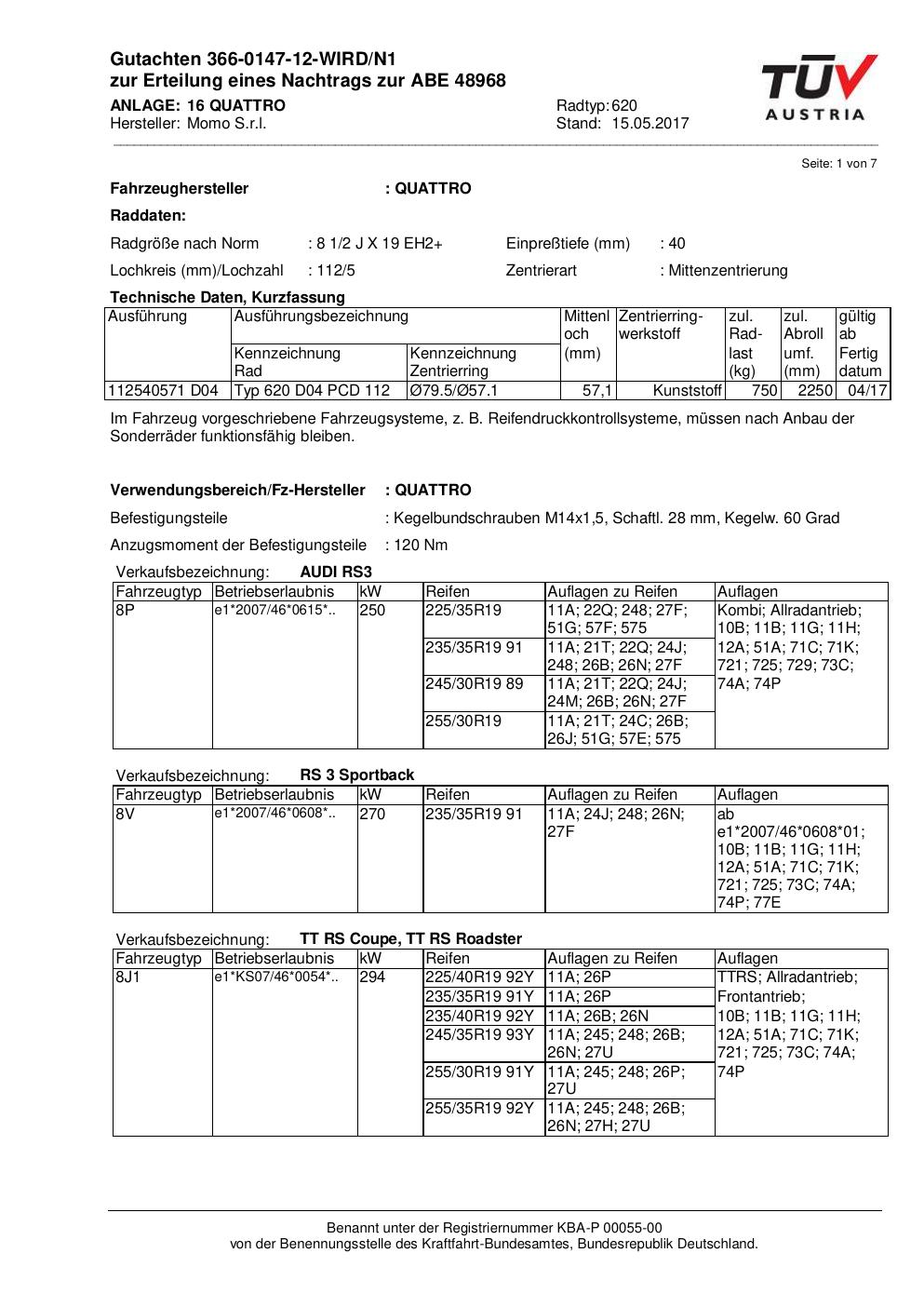 Dieses ABE gehört zur Felge Momo QUANTUM in 8.5Jx19 ET0 mit KBA 48968. Die Seite ist dafür gedacht, dass du schnell prüfen kannst, ob KBA, Design und Größe zu deiner Felge passen und danach direkt das richtige PDF lädst.