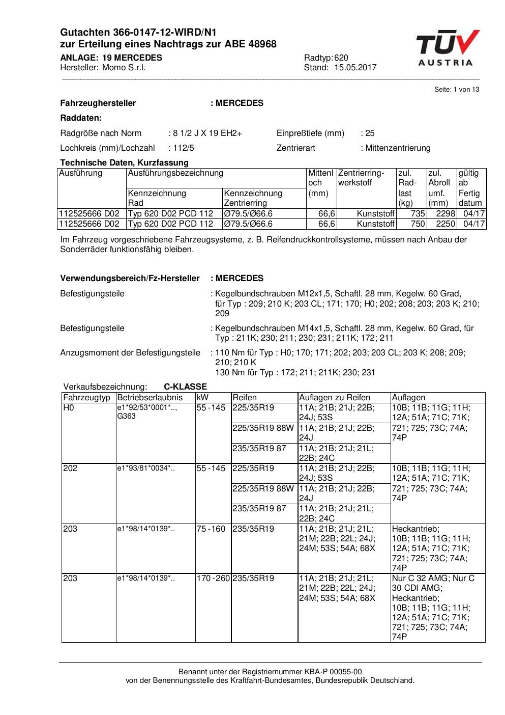 Felgengutachten / ABE für Alufelgen Momo QUANTUM (8.5Jx19 ET 0, Mittenloch 0 mm) mit KBA 48968 (Zertifikatsnummer 366-0147-12-WIRD/N1__Anlage_19). Hier kostenlos als PDF herunterladen. Der Download-Link ist 24 Stunden gültig und kann bis zu zwei Mal verwendet werden.