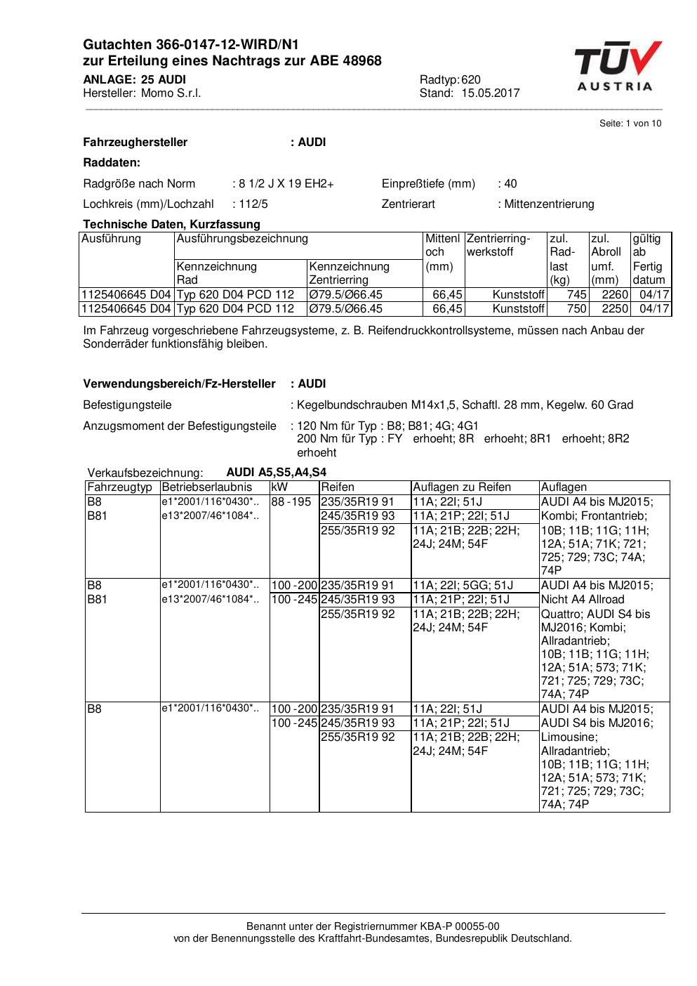 Felgengutachten / ABE für Alufelgen Momo QUANTUM (8.5Jx19 ET 0, Mittenloch 0 mm) mit KBA 48968 (Zertifikatsnummer 366-0147-12-WIRD/N1__Anlage_25). Hier kostenlos als PDF herunterladen. Der Download-Link ist 24 Stunden gültig und kann bis zu zwei Mal verwendet werden.