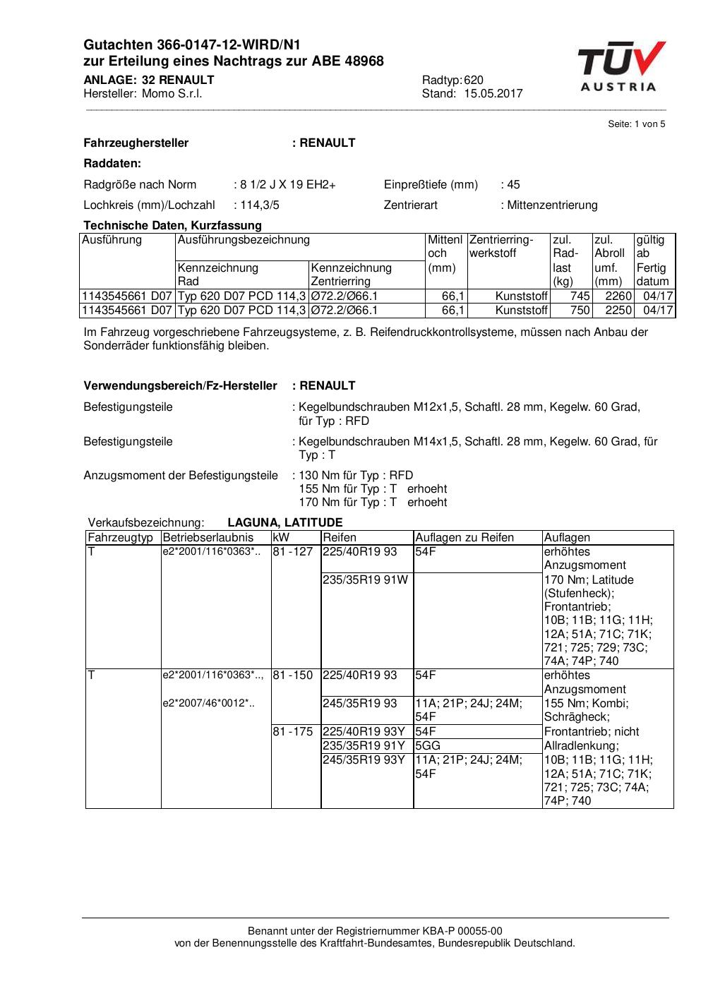 Felgengutachten / ABE für Alufelgen Momo QUANTUM (8.5Jx19 ET 0, Mittenloch 0 mm) mit KBA 48968 (Zertifikatsnummer 366-0147-12-WIRD/N1__Anlage_32). Hier kostenlos als PDF herunterladen. Der Download-Link ist 24 Stunden gültig und kann bis zu zwei Mal verwendet werden.