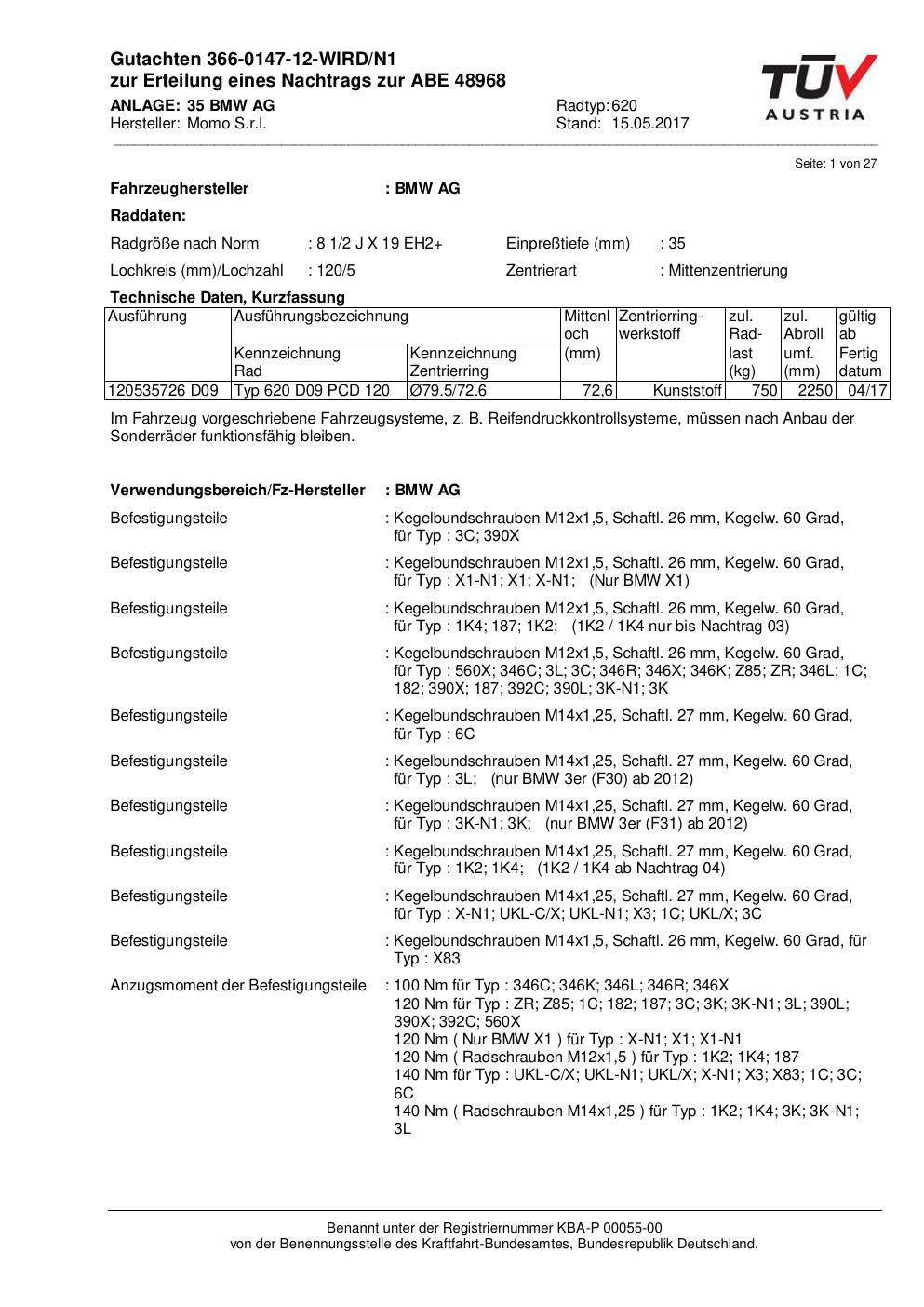 Felgengutachten / ABE für Alufelgen Momo QUANTUM (8.5Jx19 ET 0, Mittenloch 0 mm) mit KBA 48968 (Zertifikatsnummer 366-0147-12-WIRD/N1__Anlage_35). Hier kostenlos als PDF herunterladen. Der Download-Link ist 24 Stunden gültig und kann bis zu zwei Mal verwendet werden.