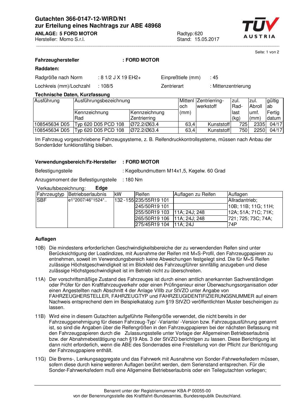Felgengutachten / ABE für Alufelgen Momo QUANTUM (8.5Jx19 ET 0, Mittenloch 0 mm) mit KBA 48968 (Zertifikatsnummer 366-0147-12-WIRD/N1__Anlage_5). Hier kostenlos als PDF herunterladen. Der Download-Link ist 24 Stunden gültig und kann bis zu zwei Mal verwendet werden.