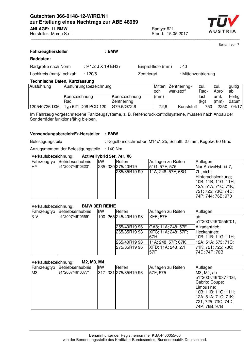 Felgengutachten / ABE für Alufelgen Momo QUANTUM (9.5Jx19 ET 0, Mittenloch 0 mm) mit KBA 48969 (Zertifikatsnummer 366-0148-12-WIRD/N1__Anlage_11). Hier kostenlos als PDF herunterladen. Der Download-Link ist 24 Stunden gültig und kann bis zu zwei Mal verwendet werden.
