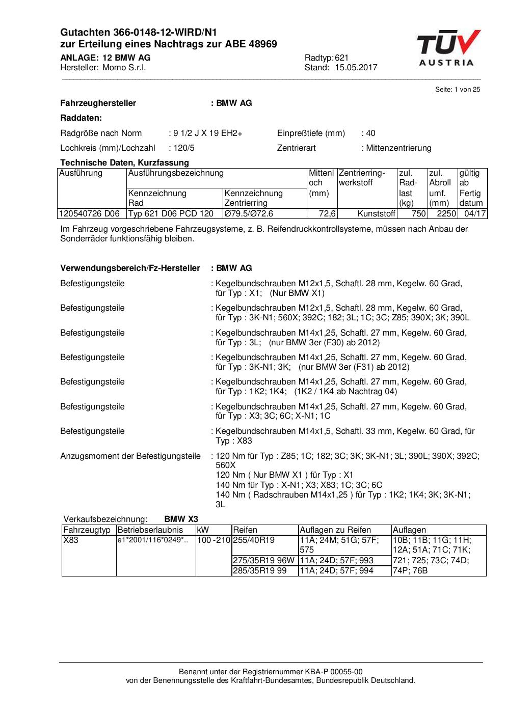 Felgengutachten / ABE für Alufelgen Momo QUANTUM (9.5Jx19 ET 0, Mittenloch 0 mm) mit KBA 48969 (Zertifikatsnummer 366-0148-12-WIRD/N1__Anlage_12). Hier kostenlos als PDF herunterladen. Der Download-Link ist 24 Stunden gültig und kann bis zu zwei Mal verwendet werden.