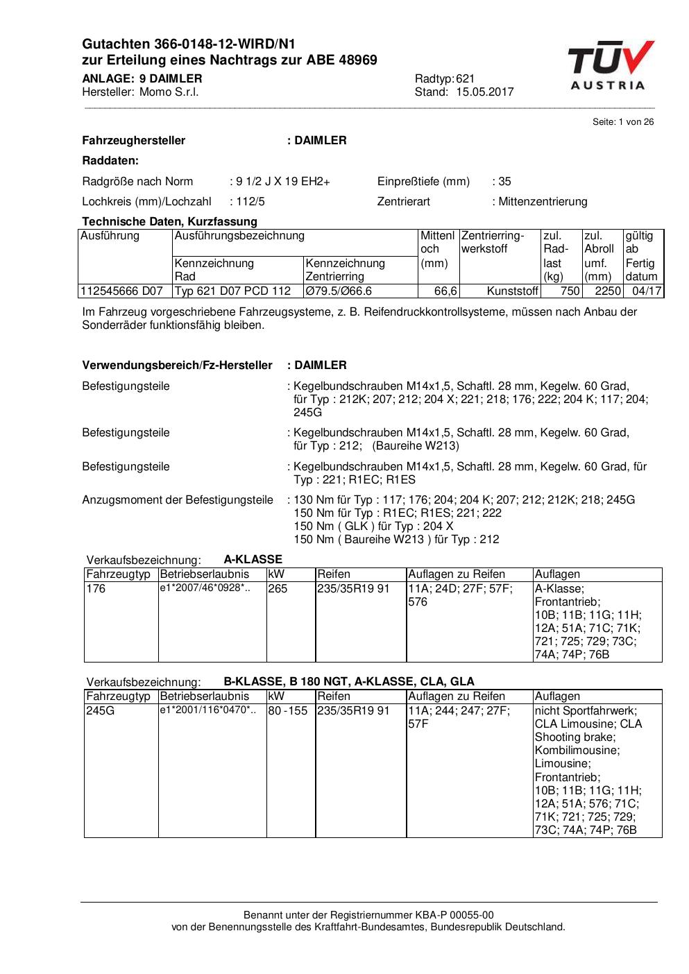 Felgengutachten / ABE für Alufelgen Momo QUANTUM (9.5Jx19 ET 0, Mittenloch 0 mm) mit KBA 48969 (Zertifikatsnummer 366-0148-12-WIRD/N1__Anlage_9). Hier kostenlos als PDF herunterladen. Der Download-Link ist 24 Stunden gültig und kann bis zu zwei Mal verwendet werden.