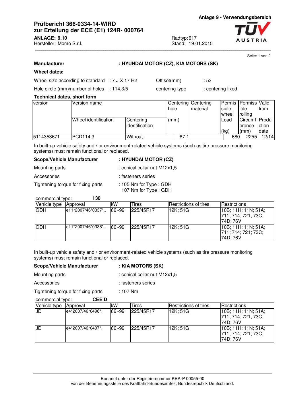 Felgengutachten / ECE für Alufelgen Momo QUANTUM (7Jx17 ET 0, Mittenloch 0 mm) mit KBA 000764 (Zertifikatsnummer 366-0334-14-WIRD__Anlage_10). Hier kostenlos als PDF herunterladen. Der Download-Link ist 24 Stunden gültig und kann bis zu zwei Mal verwendet werden.