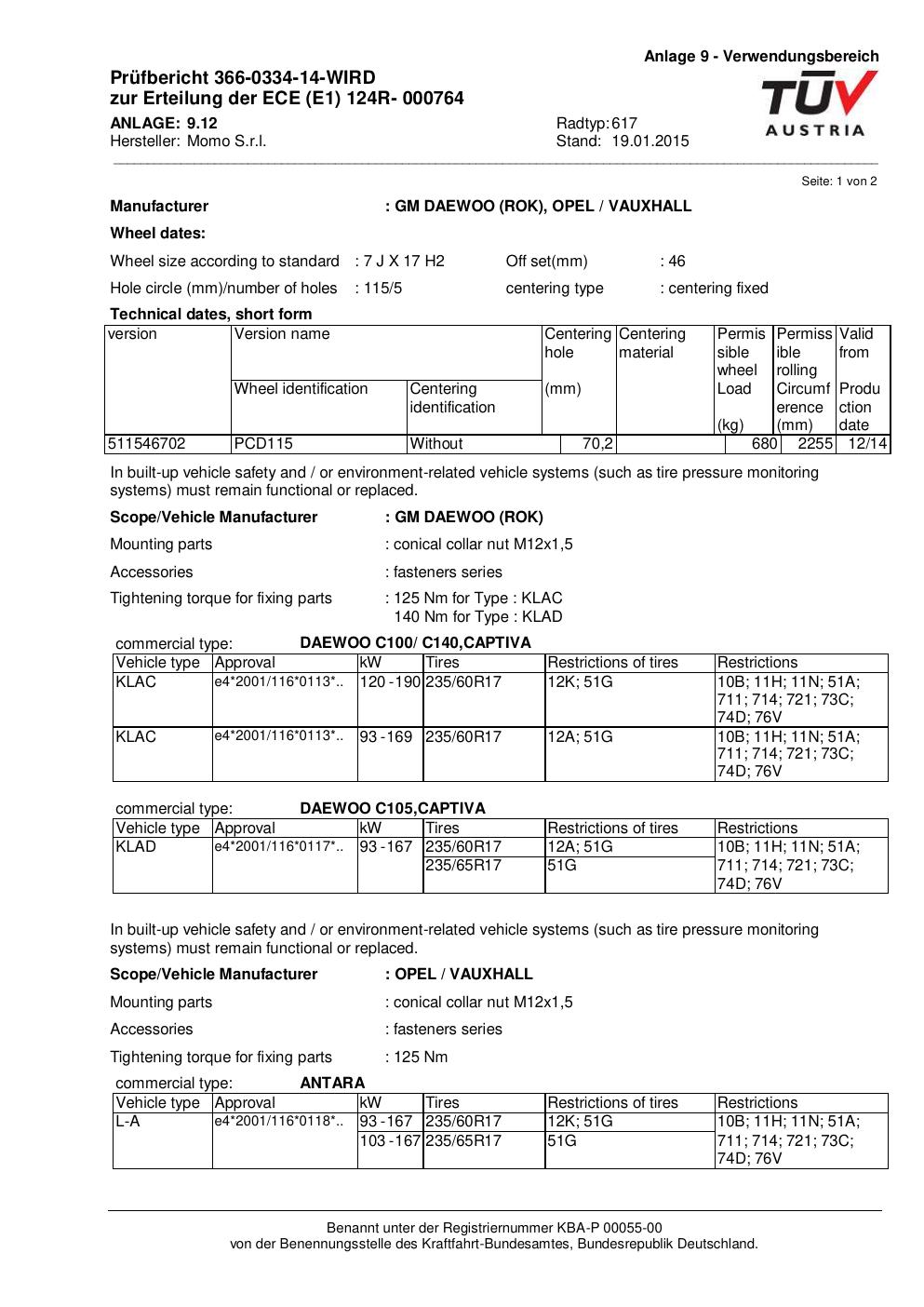 Felgengutachten / ECE für Alufelgen Momo QUANTUM (7Jx17 ET 0, Mittenloch 0 mm) mit KBA 000764 (Zertifikatsnummer 366-0334-14-WIRD__Anlage_12). Hier kostenlos als PDF herunterladen. Der Download-Link ist 24 Stunden gültig und kann bis zu zwei Mal verwendet werden.