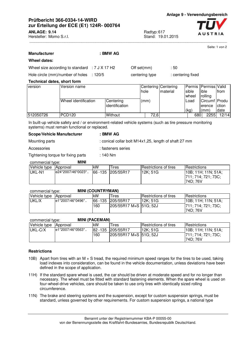 Felgengutachten / ECE für Alufelgen Momo QUANTUM (7Jx17 ET 0, Mittenloch 0 mm) mit KBA 000764 (Zertifikatsnummer 366-0334-14-WIRD__Anlage_14). Hier kostenlos als PDF herunterladen. Der Download-Link ist 24 Stunden gültig und kann bis zu zwei Mal verwendet werden.
