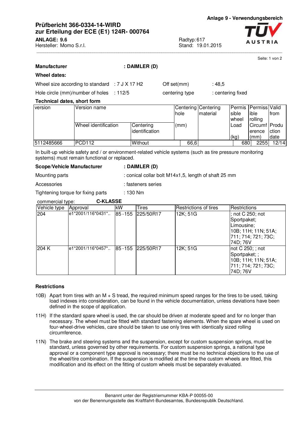 Felgengutachten / ECE für Alufelgen Momo QUANTUM (7Jx17 ET 0, Mittenloch 0 mm) mit KBA 000764 (Zertifikatsnummer 366-0334-14-WIRD__Anlage_6). Hier kostenlos als PDF herunterladen. Der Download-Link ist 24 Stunden gültig und kann bis zu zwei Mal verwendet werden.