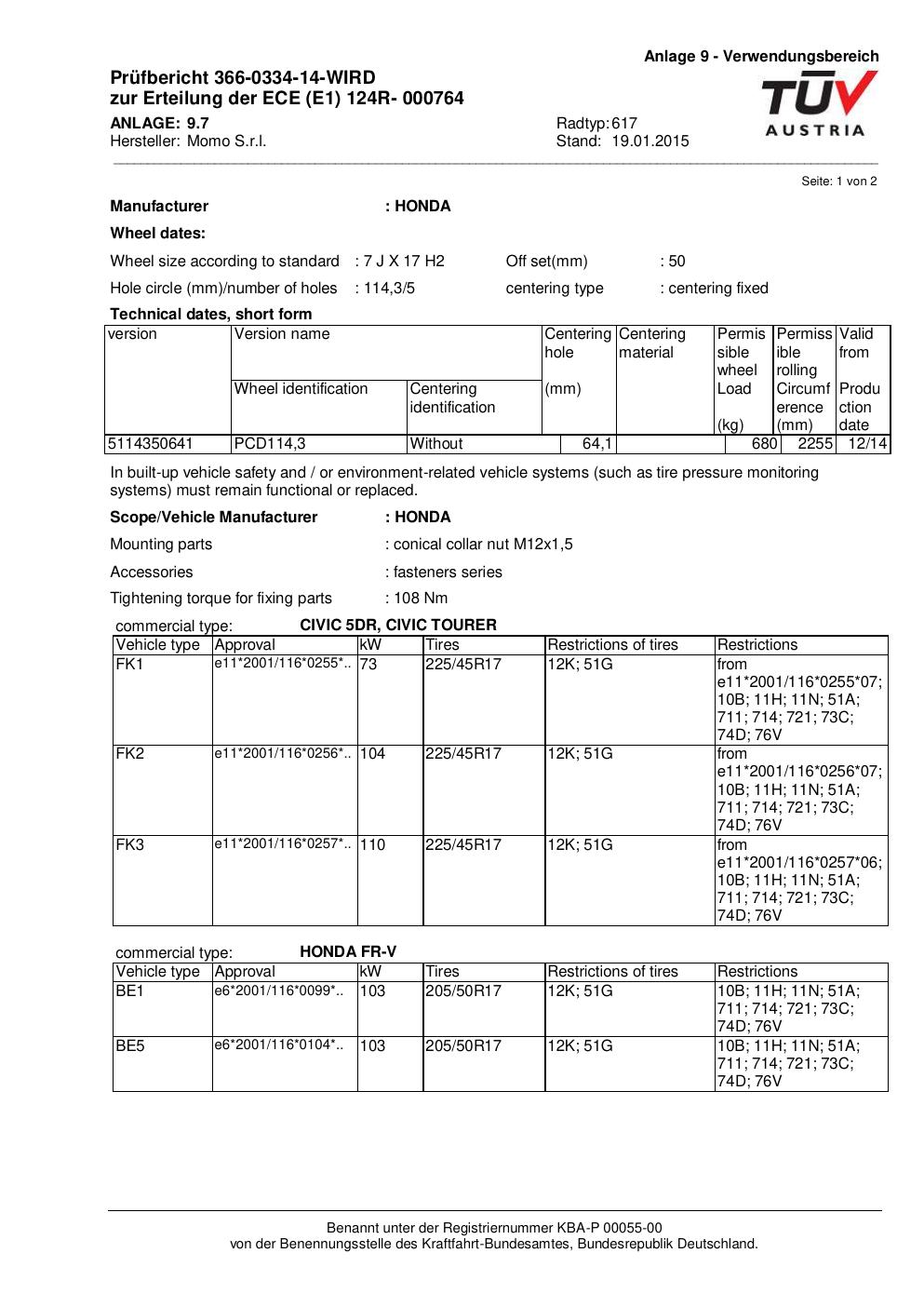 Felgengutachten / ECE für Alufelgen Momo QUANTUM (7Jx17 ET 0, Mittenloch 0 mm) mit KBA 000764 (Zertifikatsnummer 366-0334-14-WIRD__Anlage_7). Hier kostenlos als PDF herunterladen. Der Download-Link ist 24 Stunden gültig und kann bis zu zwei Mal verwendet werden.
