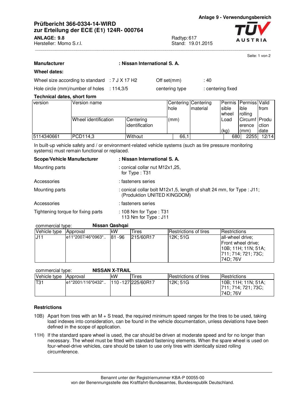 Felgengutachten / ECE für Alufelgen Momo QUANTUM (7Jx17 ET 0, Mittenloch 0 mm) mit KBA 000764 (Zertifikatsnummer 366-0334-14-WIRD__Anlage_8). Hier kostenlos als PDF herunterladen. Der Download-Link ist 24 Stunden gültig und kann bis zu zwei Mal verwendet werden.