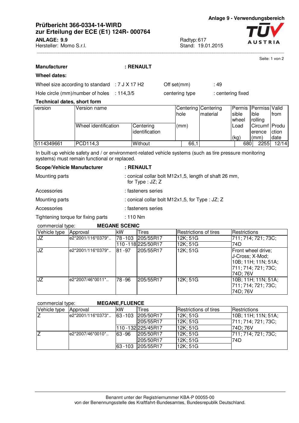 Felgengutachten / ECE für Alufelgen Momo QUANTUM (7Jx17 ET 0, Mittenloch 0 mm) mit KBA 000764 (Zertifikatsnummer 366-0334-14-WIRD__Anlage_9). Hier kostenlos als PDF herunterladen. Der Download-Link ist 24 Stunden gültig und kann bis zu zwei Mal verwendet werden.