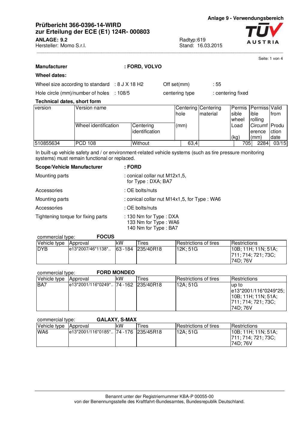 Felgengutachten / ECE für Alufelgen Momo QUANTUM (8Jx18 ET 0, Mittenloch 0 mm) mit KBA 000803 (Zertifikatsnummer 366-0396-14-WIRD__Anlage_2). Hier kostenlos als PDF herunterladen. Der Download-Link ist 24 Stunden gültig und kann bis zu zwei Mal verwendet werden.