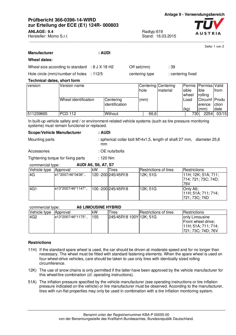 Felgengutachten / ECE für Alufelgen Momo QUANTUM (8Jx18 ET 0, Mittenloch 0 mm) mit KBA 000803 (Zertifikatsnummer 366-0396-14-WIRD__Anlage_4). Hier kostenlos als PDF herunterladen. Der Download-Link ist 24 Stunden gültig und kann bis zu zwei Mal verwendet werden.