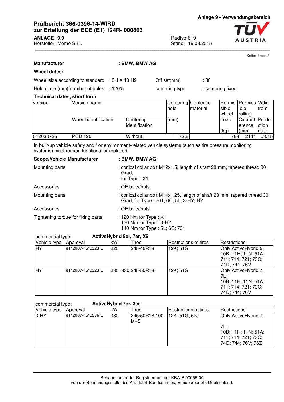 Felgengutachten / ECE für Alufelgen Momo QUANTUM (8Jx18 ET 0, Mittenloch 0 mm) mit KBA 000803 (Zertifikatsnummer 366-0396-14-WIRD__Anlage_9). Hier kostenlos als PDF herunterladen. Der Download-Link ist 24 Stunden gültig und kann bis zu zwei Mal verwendet werden.